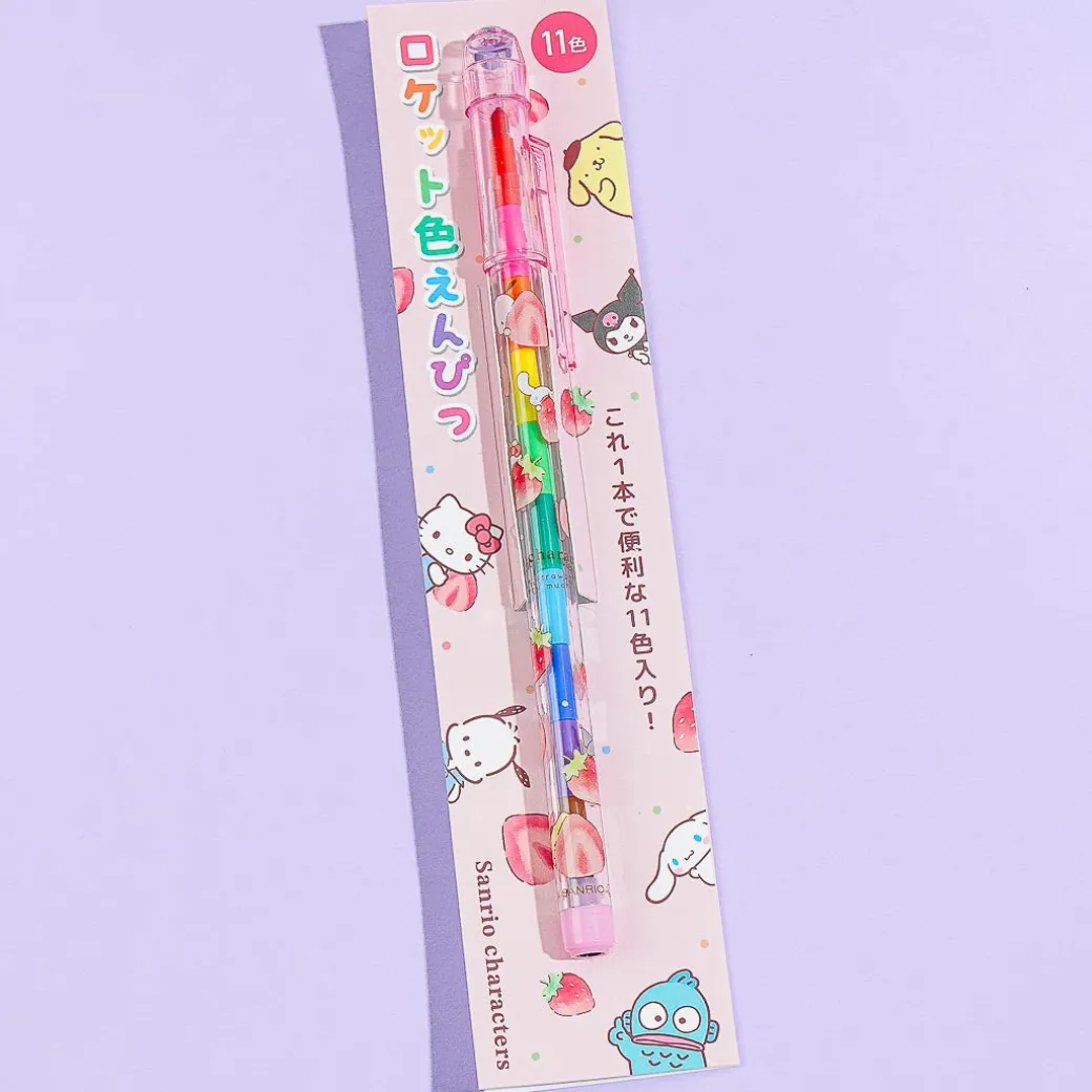 Draw and color your favorite characters using this super cute rocket pencil. It features prints of Sanrio Characters and strawberries. The stacking points come in different colors!