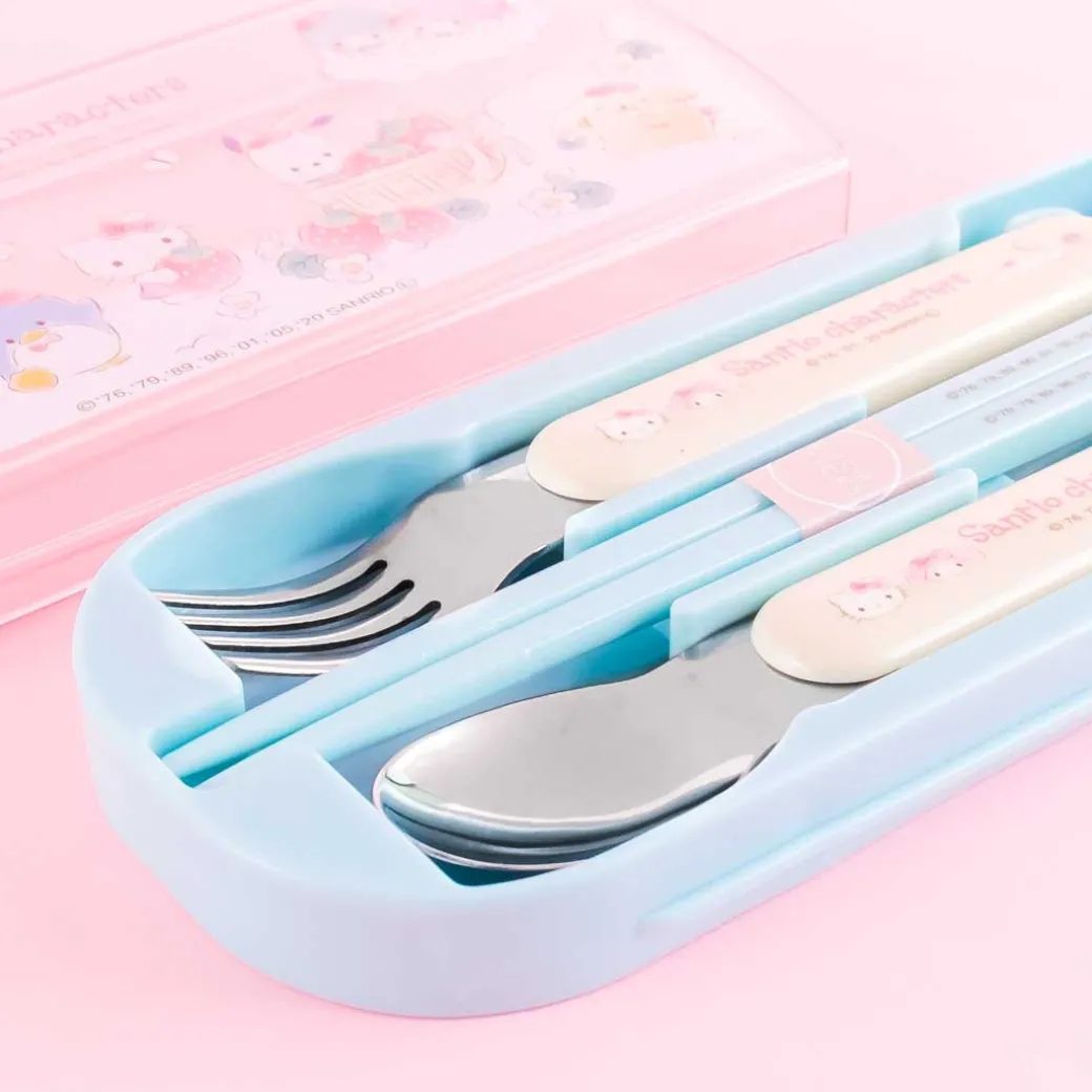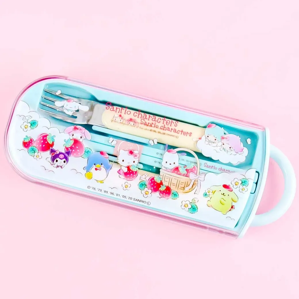 - A cutlery set with illustrations of Sanrio characters in a field of strawberries