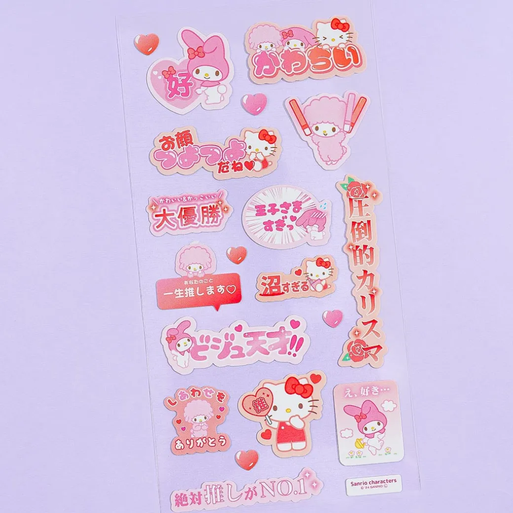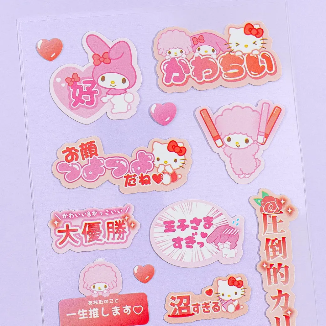 Use this super kawaii sheet of stickers to decorate your journal. It features prints of Sanrio’s sweet girls My Melody, My Sweet Piano, and Hello Kitty with encouraging messages written in Japanese. This sticker sheet comes from the Sanrio Sukip series!