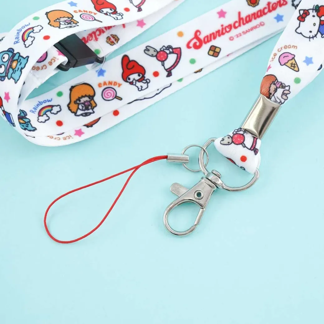 - A kawaii lanyard decorated with prints of Sanrio characters and yummy goodies