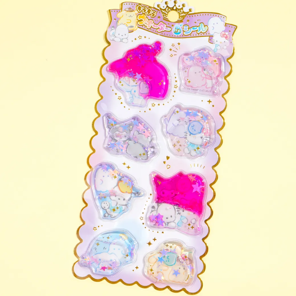 Decorate your journal with these super kawaii stickers! These special seals contain water with floating glitter and stars inside! The sheet is illustrated with different cute prints of the Sanrio Characters playing with the Obakenu ghosts.