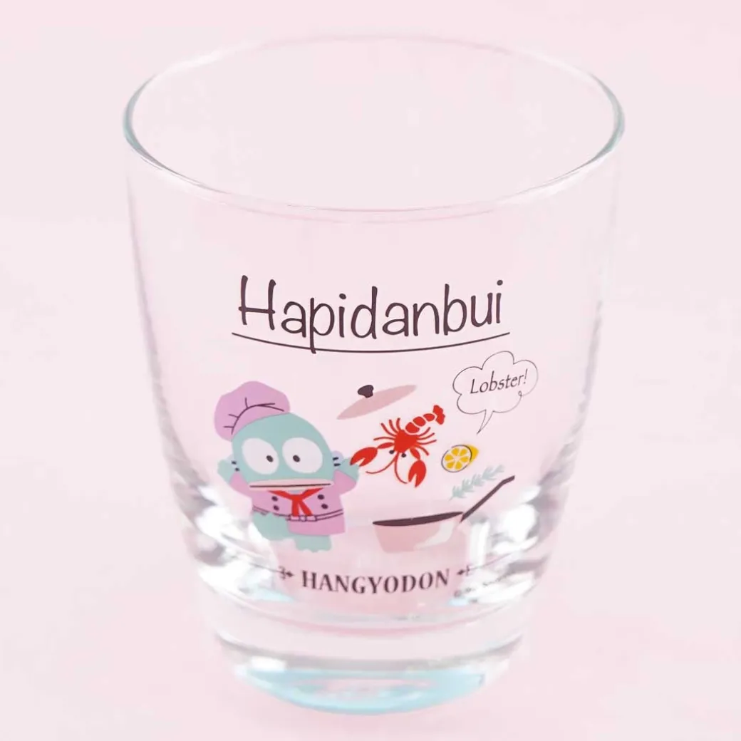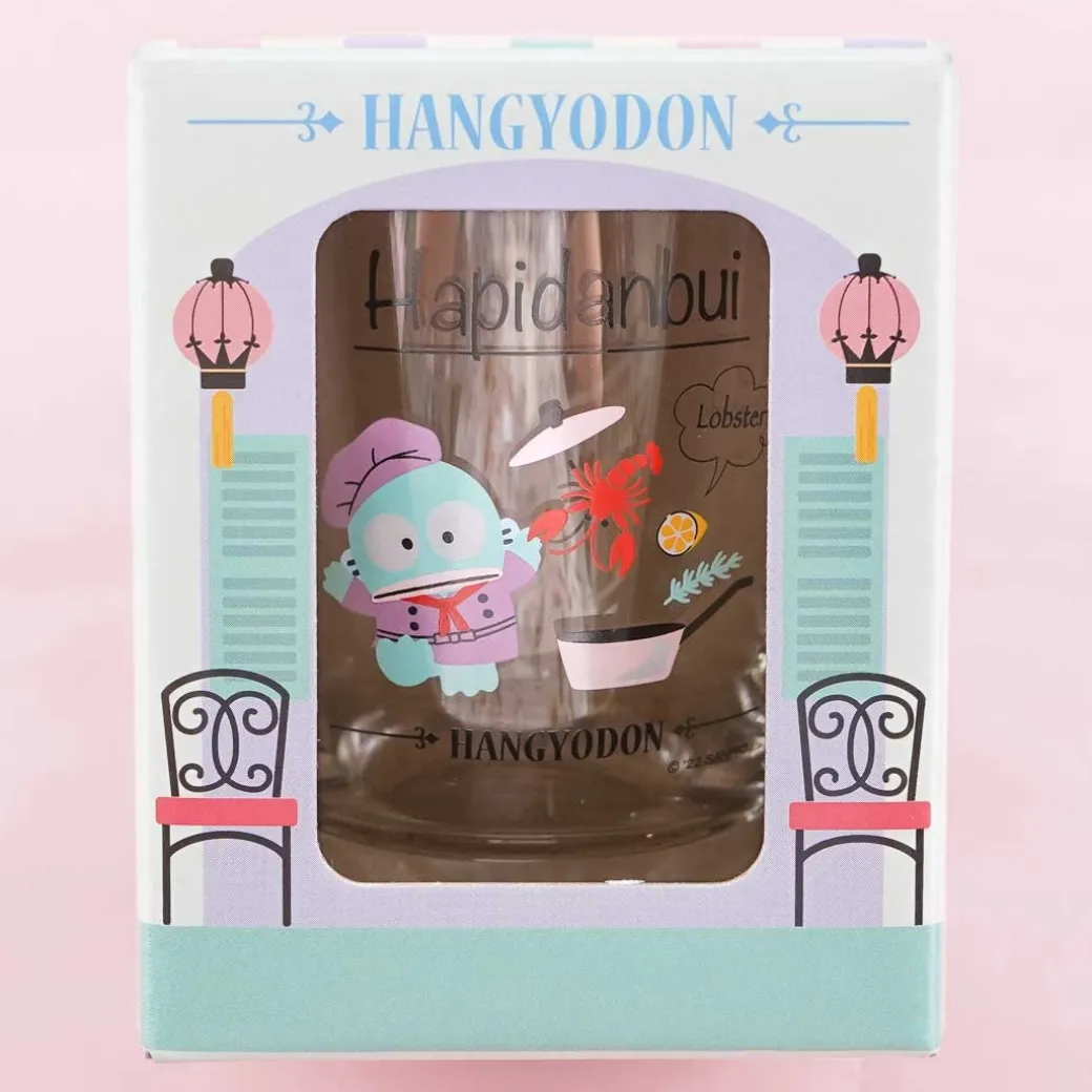 - A kawaii drinking glass with a print of Hangyodon as a chef