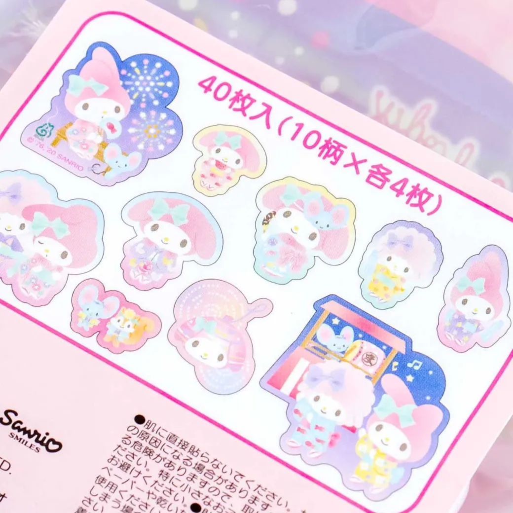 - A pack of deco stickers featuring My Melody and friends attending a summer festival