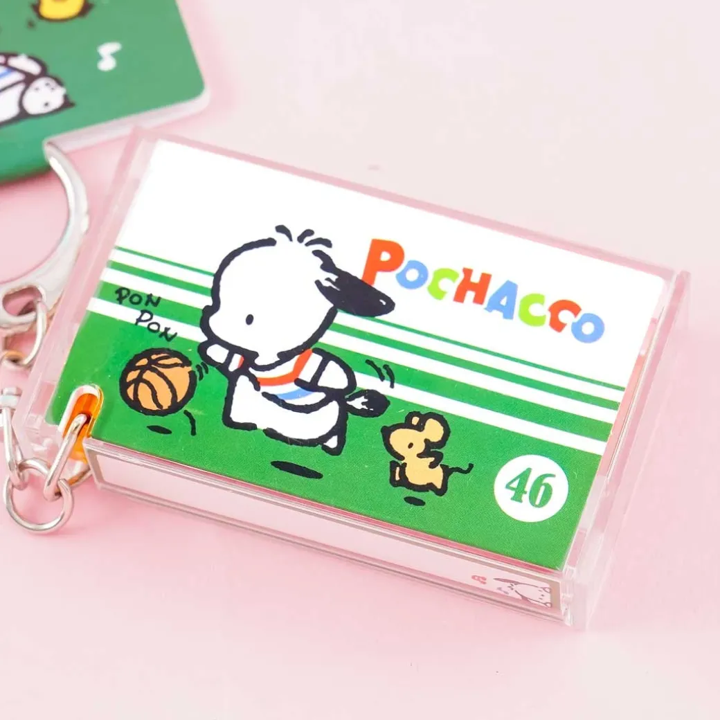 - A kawaii cassette album charm decorated with illustrations of Pochacco playing basketball