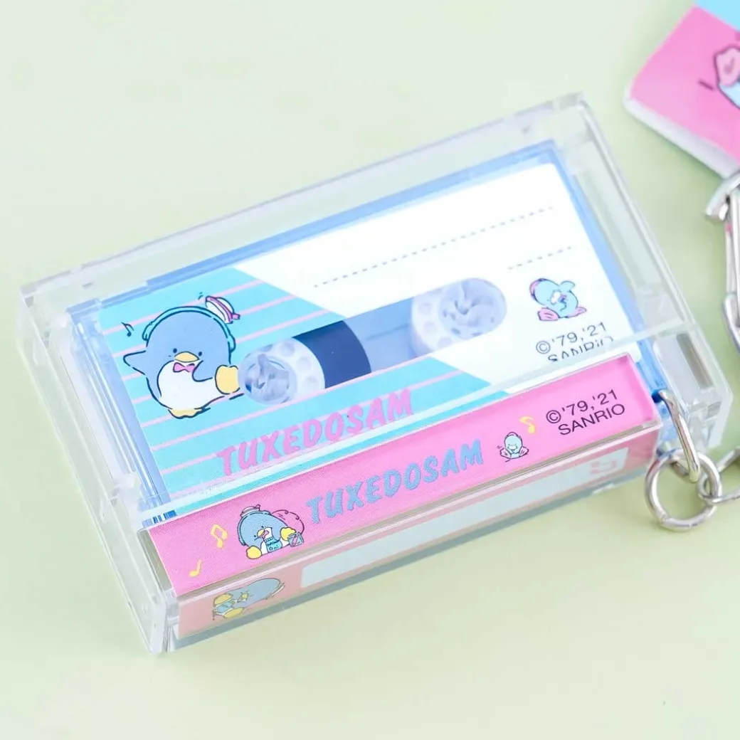 - A super cute cassette-shaped charm with prints of Tuxedosam listening to music
