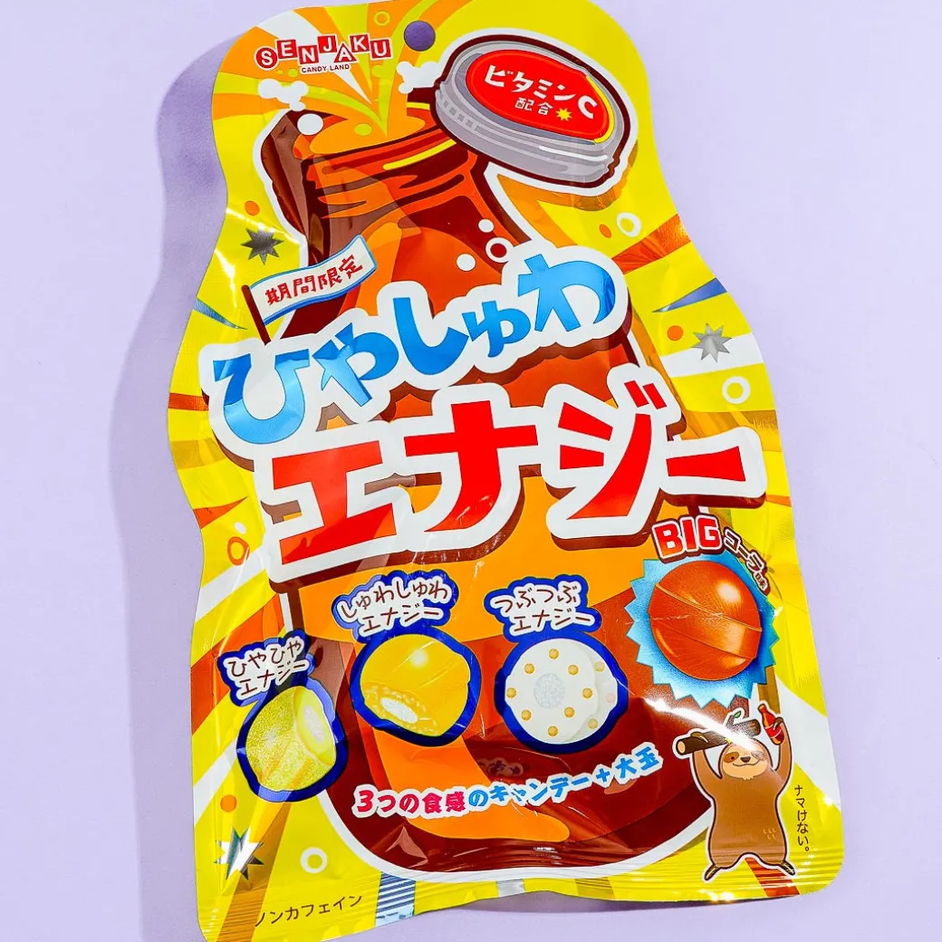 This pack of candy is the perfect pick-me-up treat to get you energized. Enjoy the three different types of energy drink flavors in the pack – hiyahiya energy drink, shuwashuwa energy drink , and tsubu-tsubu energy drink. You can also find one big large cola-flavored candy inside the pack!