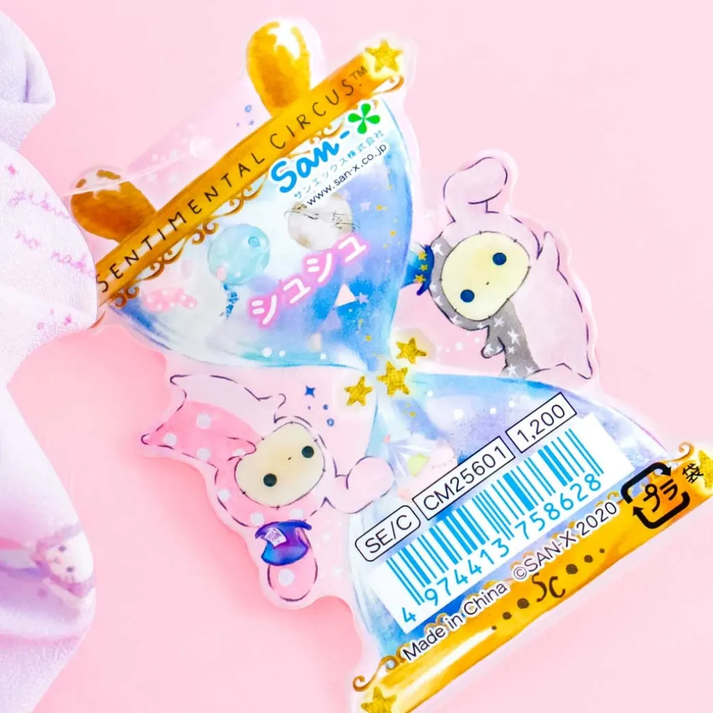 - A bow-shaped hair scrunchie featuring Sentimental Circus characters