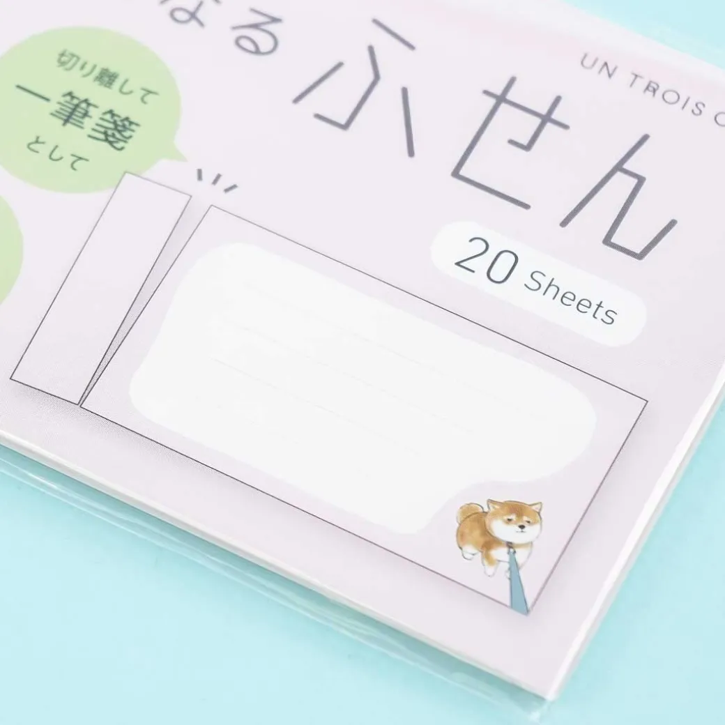 - A pad of sticky notes with an illustration of a Shiba Inu out on a walk from the artist Juno