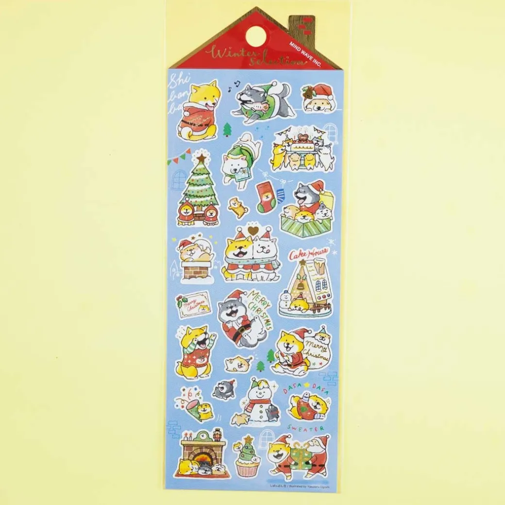 - A super kawaii sheet of die-cut stickers with golden details featuring Shibanban characters having fun during Christmas