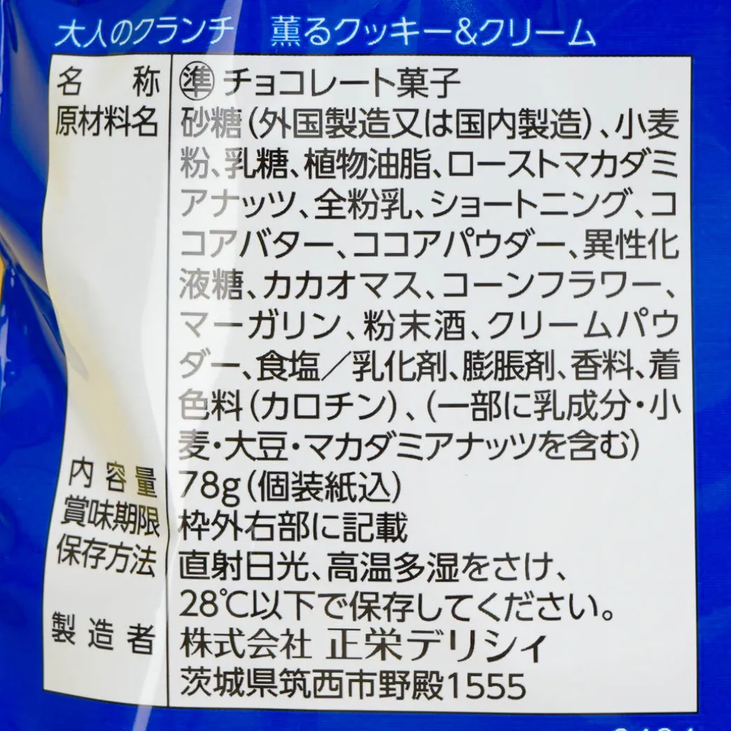 This deliciously crunchy chocolate treat is perfect for adults! It’s made with creamy white chocolate with a hint of rum, mixed with bitter cocoa cookies, vanilla cookies, and roasted macadamia nuts. The taste of cookies and cream spreads as you chew it, and the rum gives it a more refined and sophisticated taste!