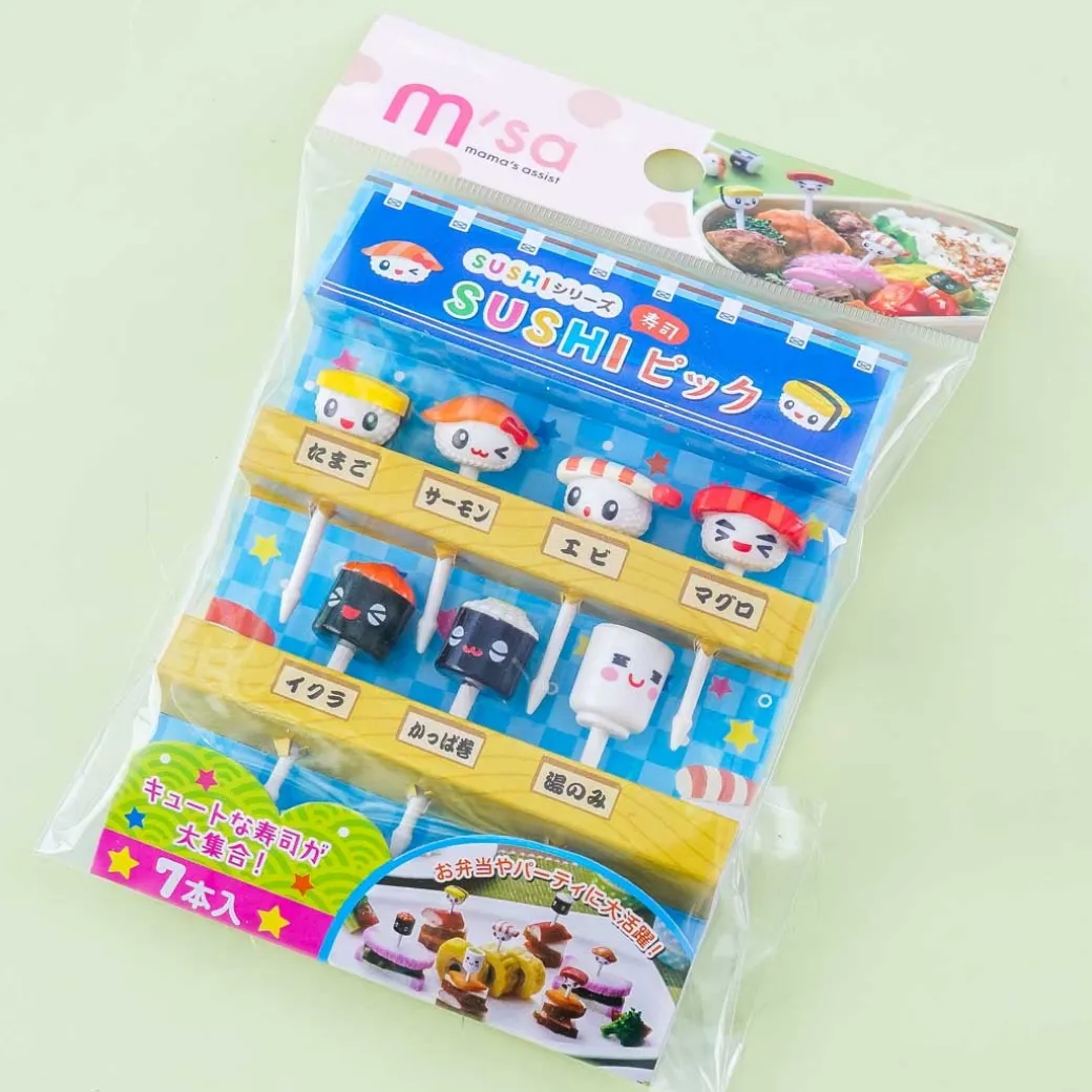 - A cute set of food picks made to look like sushi characters