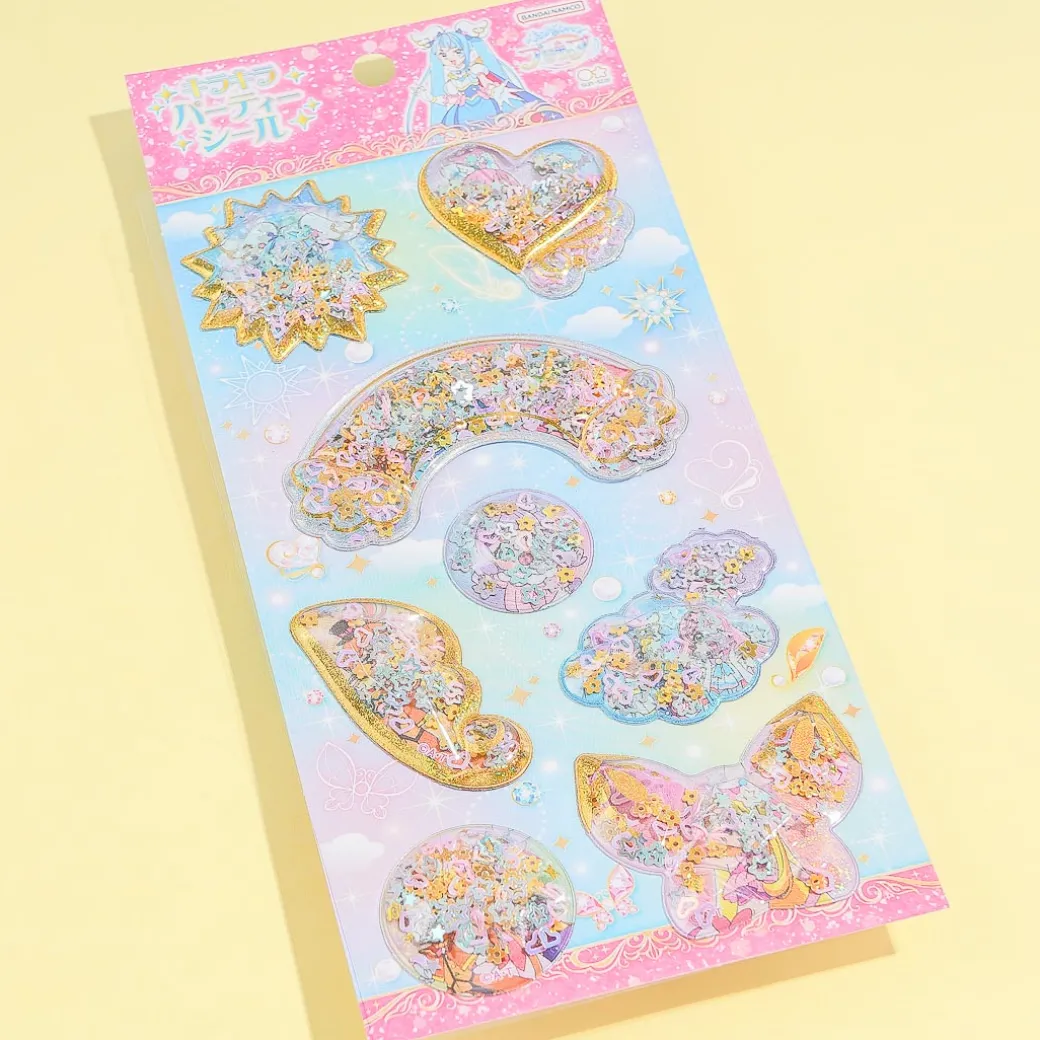 Embellish the cover of your diary with these cute water stickers. They showcase prints of Soaring Sky! Pretty cure characters! Each water sticker has glitter inside that shakes and sparkles.