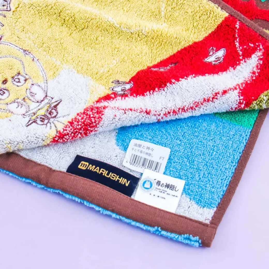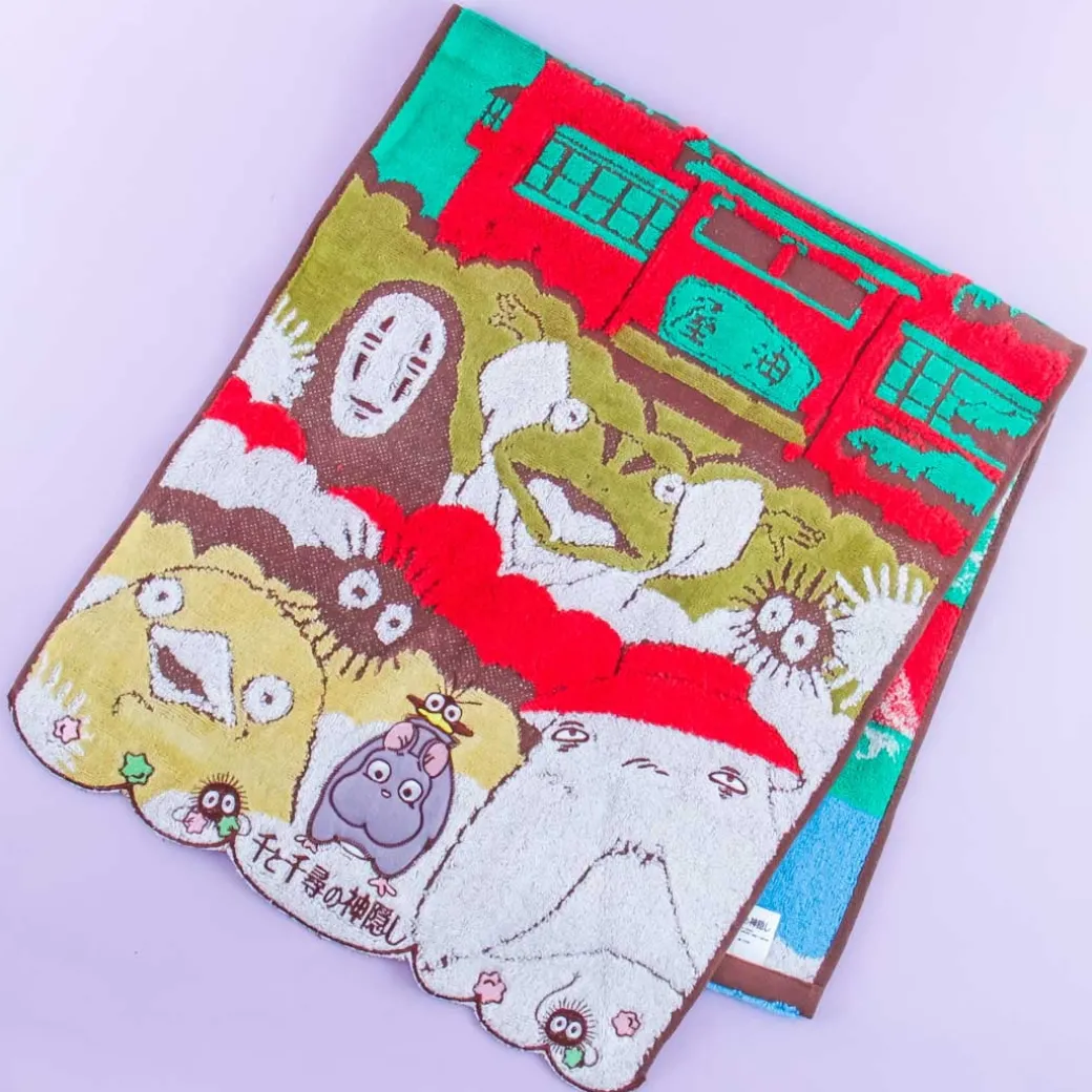 - A cute long towel covered in prints of Spirited Away characters gathered outside the bathhouse