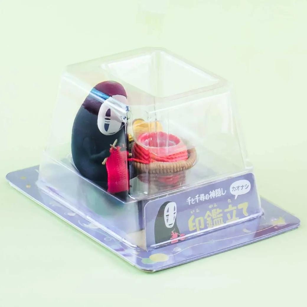 - A super cute No-Face stand figure from Spirited Away sitting down knitting