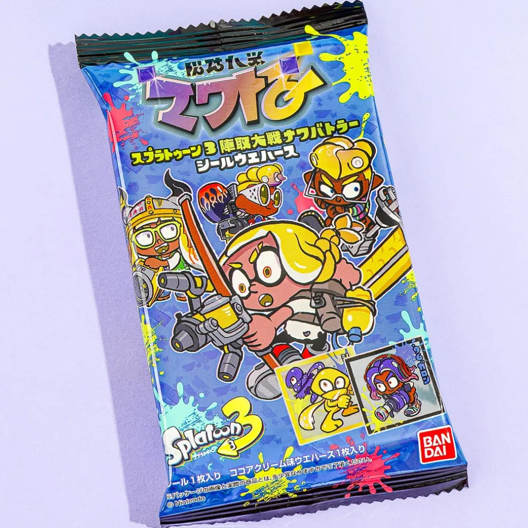 Have fun snacking on this yummy wafer filled with cocoa cream! It also comes with a free sticker featuring illustrations of Nawa Battler from the Nintendo game Splatoon 3. All stickers are metallic or foil-stamped!