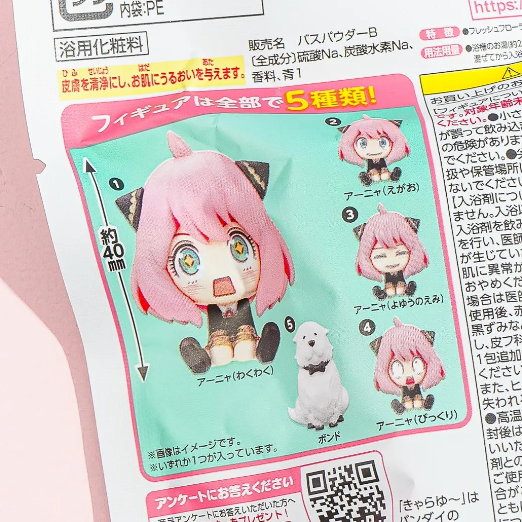 Have fun in the bath with this pack of bath salts! It features a parent of Anya from SPY x FAMILY making faces. This pack of bath salts comes with a collectible SPY x FAMILY figure. Surprise yourself with a random design taken from a set of 5 different figures.