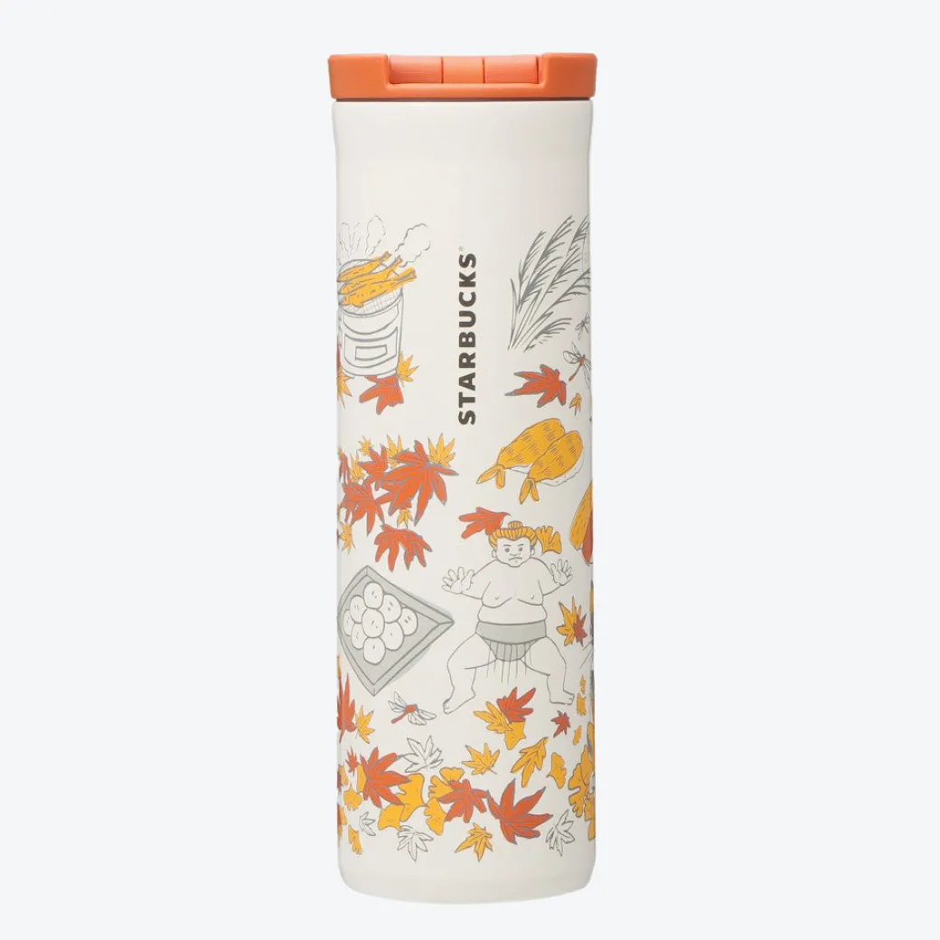 Use this Starbucks Japan-exclusive tumbler for your hot or cold drinks! It showcases a cute illustration of Japanese icons with autumn leaves and rice fields. This tumbler is made with double-walled structure stainless steel so it works well in keeping your drink hot or cold. It also features a rubber flip lid.