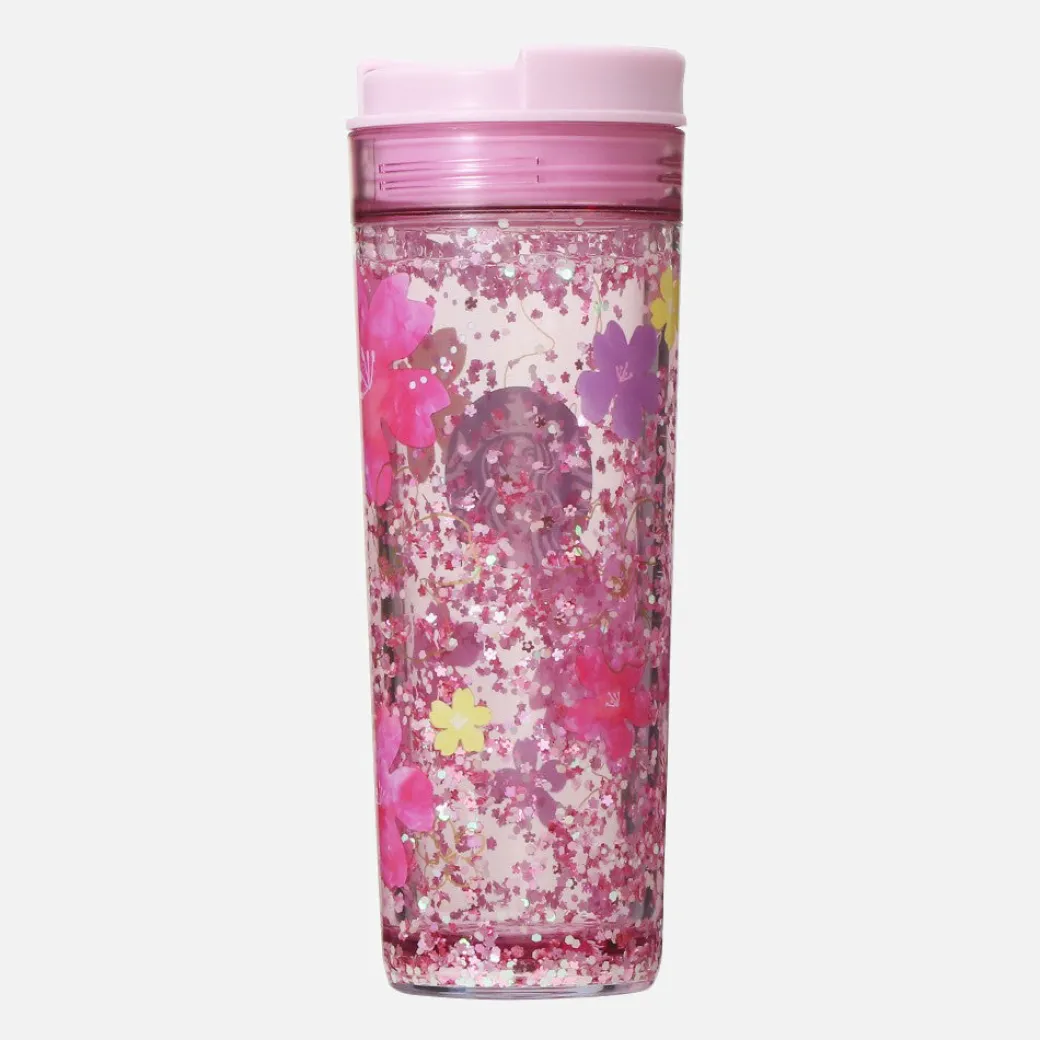 Bring along your favorite drink while walking through the park with the help of this glittery sakura-print water tumbler from Starbucks Japan! It has a double-walled design filled with water and glitter that dances when you tilt it. This tumbler is part of the Starbucks SAKURA 2024 collection.