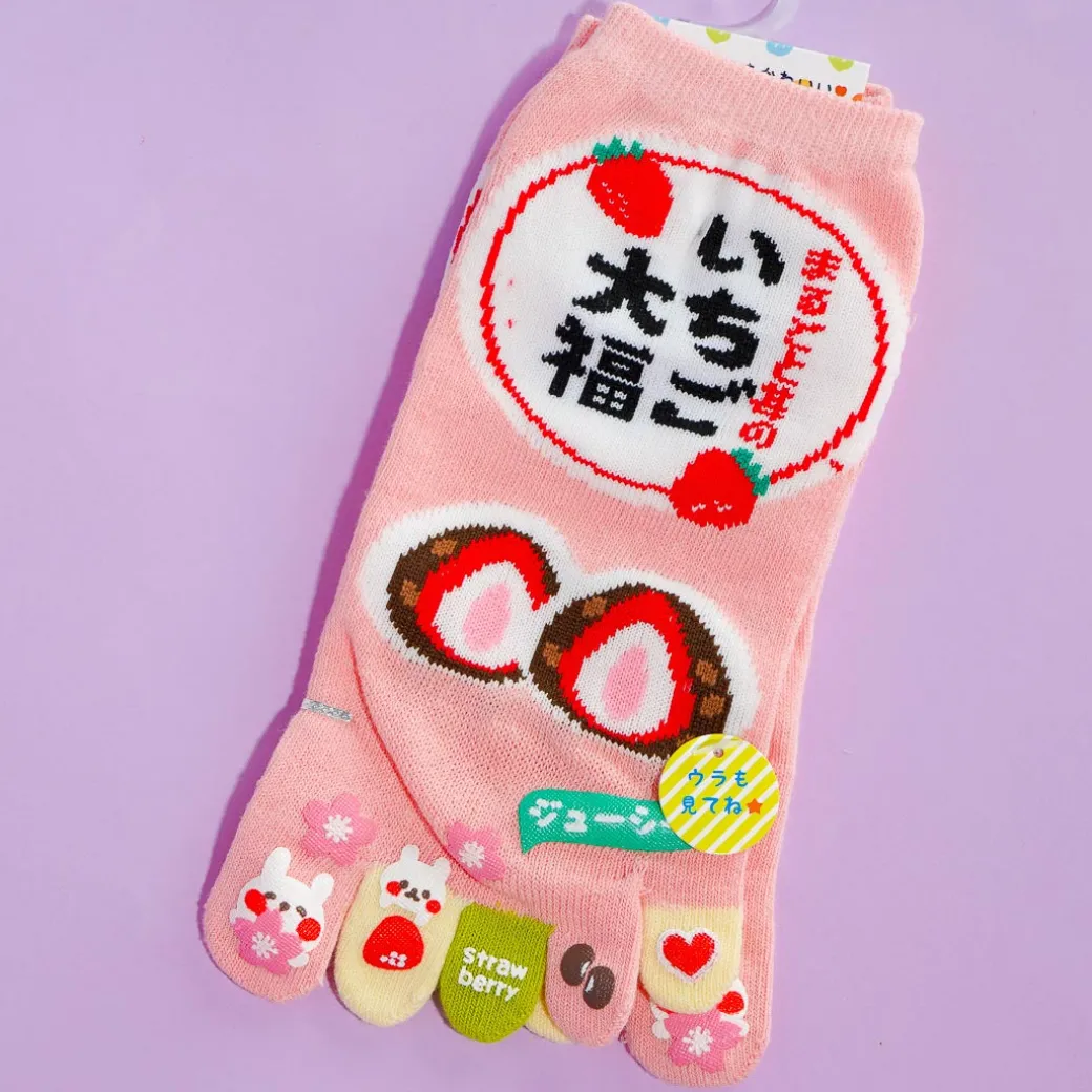 Stay comfy at home by wearing these cute toe socks! These ankle-length socks showcase prints of yummy strawberry daifuku (a tasty Japanese strawberry mochi). Each toe tip has a cute little print!