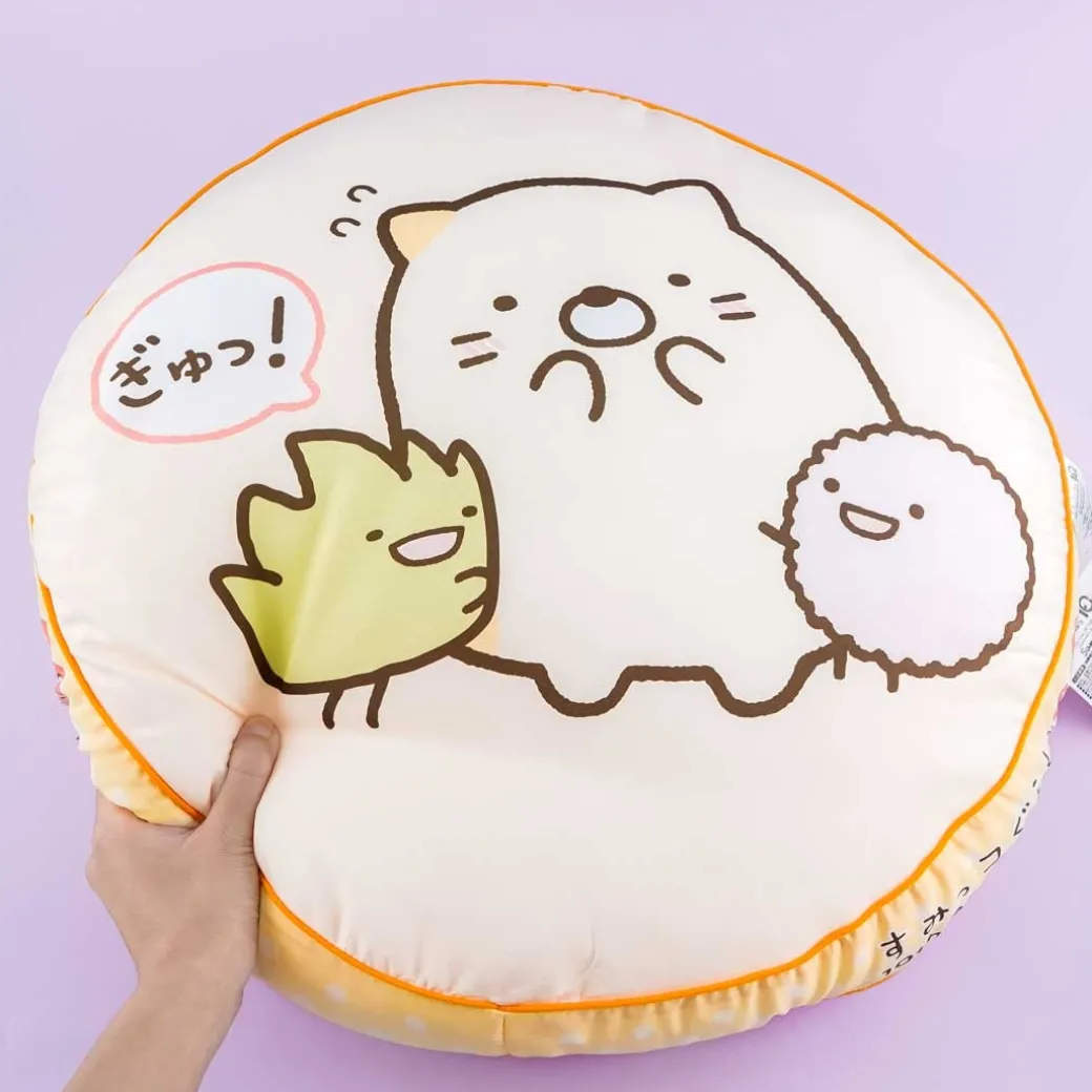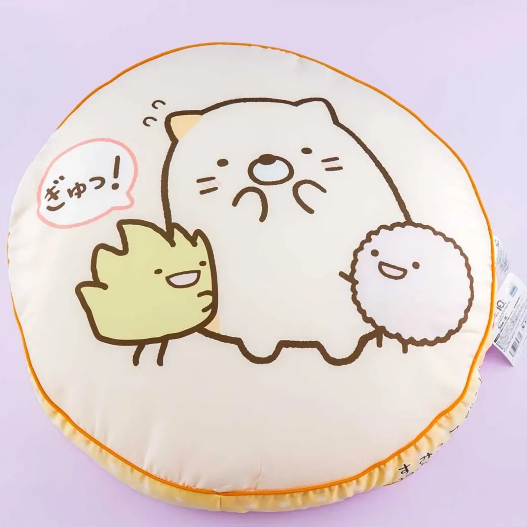 - A kawaii round pillow with prints of Neko and friends from Sumikko Gurashi