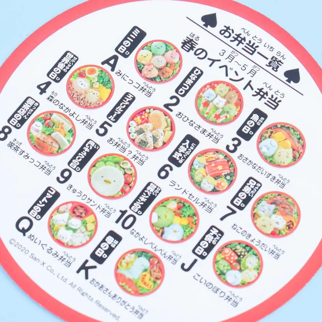 - A super kawaii round playing card set featuring prints of bento food items shaped like the Sumikko Gurashi