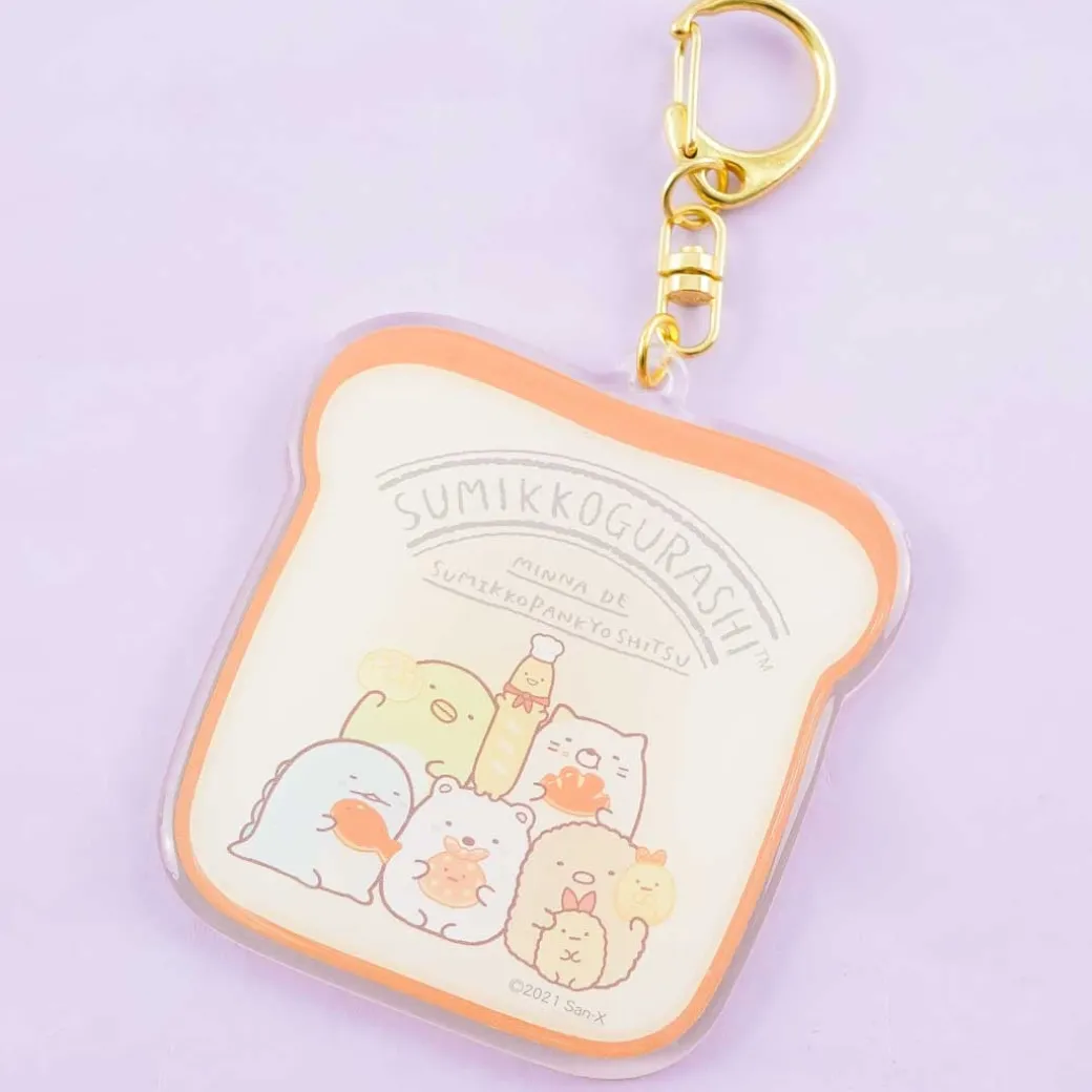 - A super cute die-cut bread-shaped bag charm featuring the Sumikko Gurashi gang eating pastries
