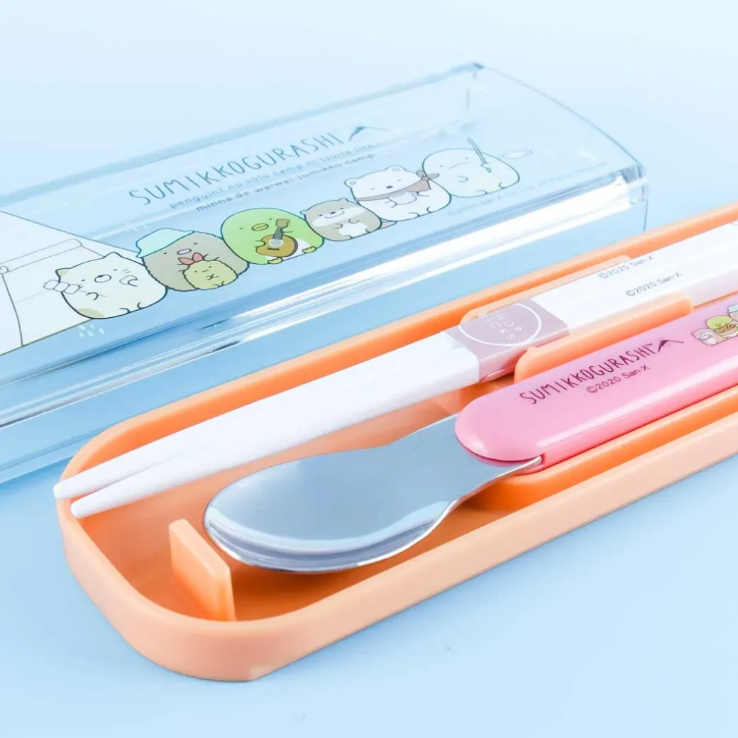 - A cutlery set with illustrations of Sumikko Gurashi characters camping