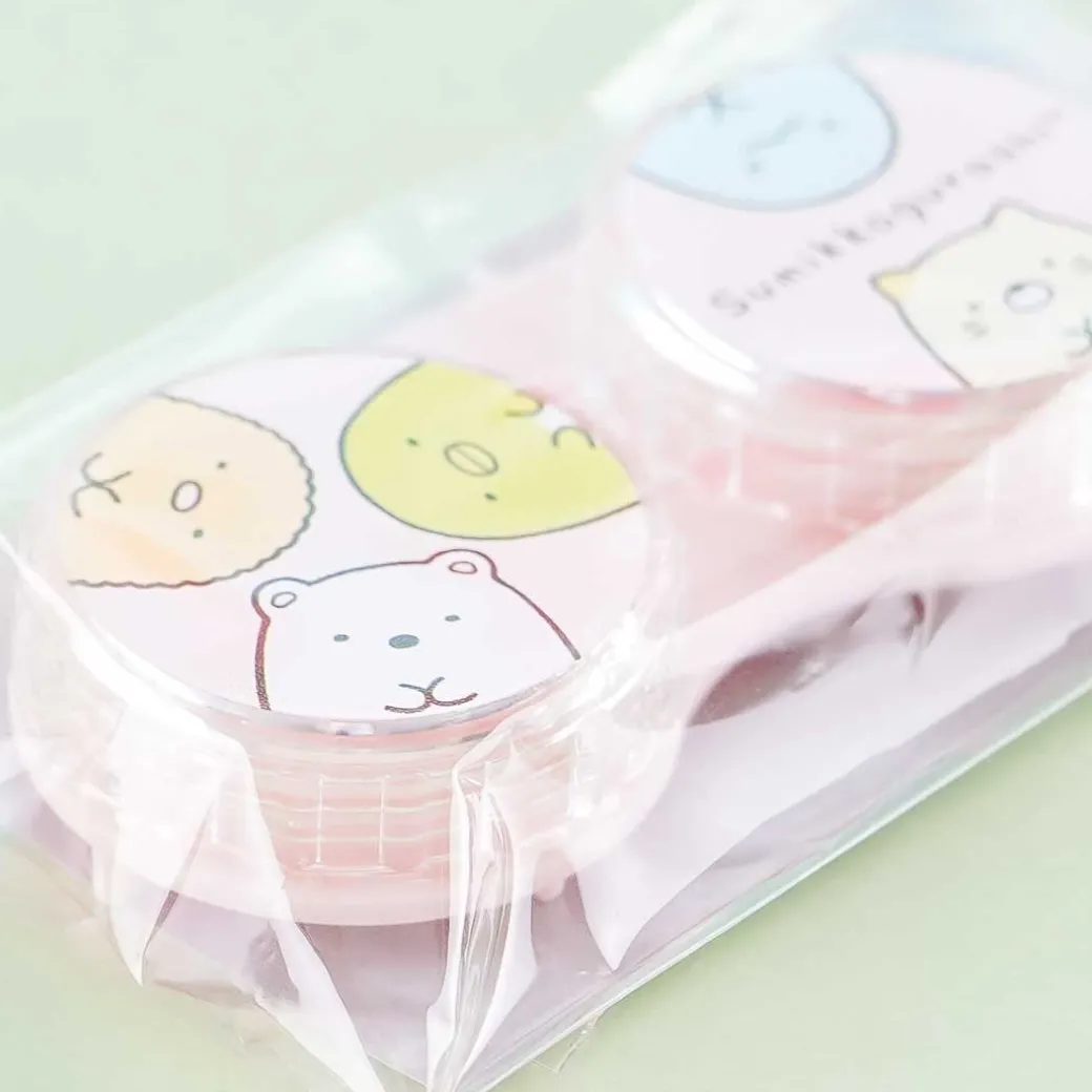 - A kawaii contact lens case featuring prints of the Sumikko Gurashi gang gathered in a circle