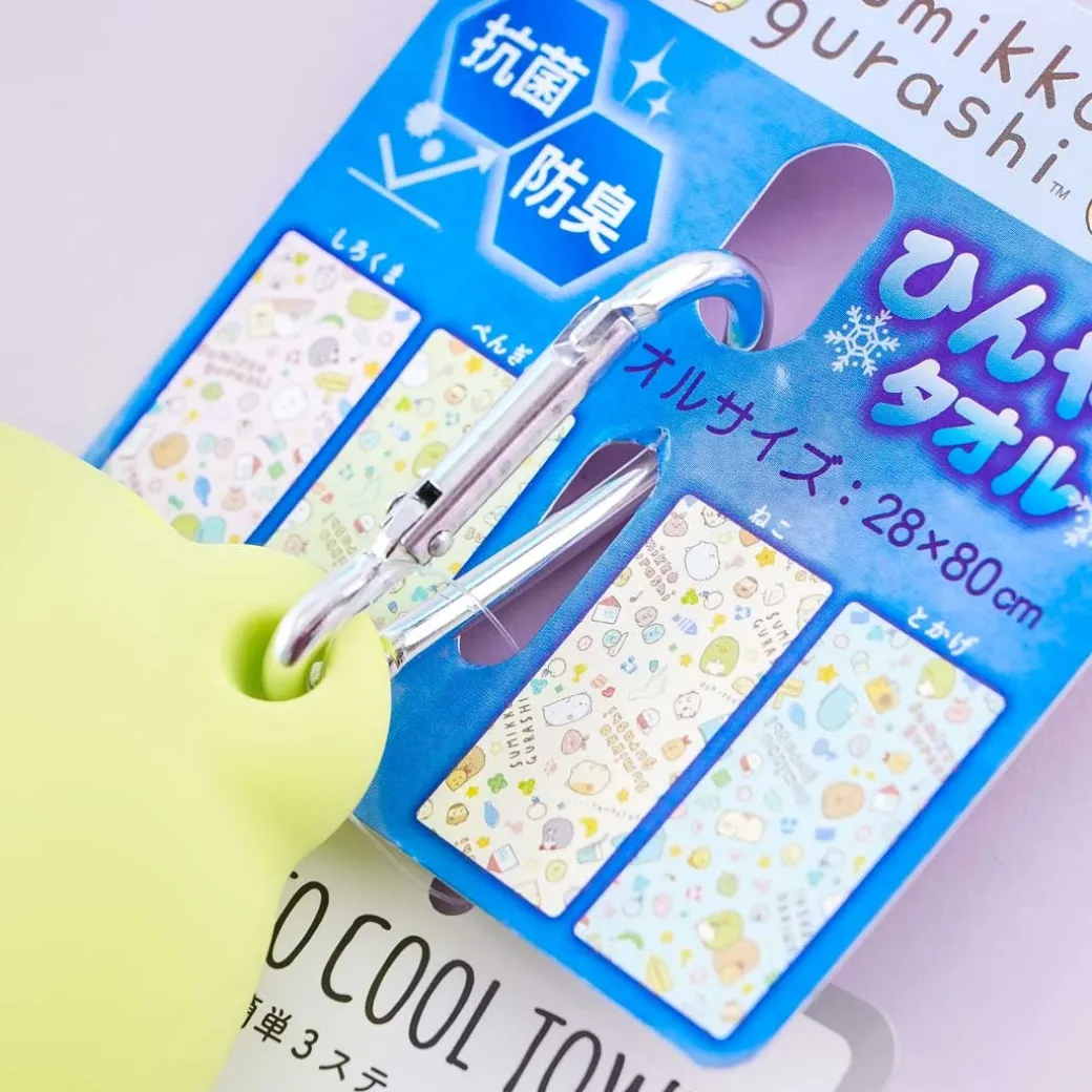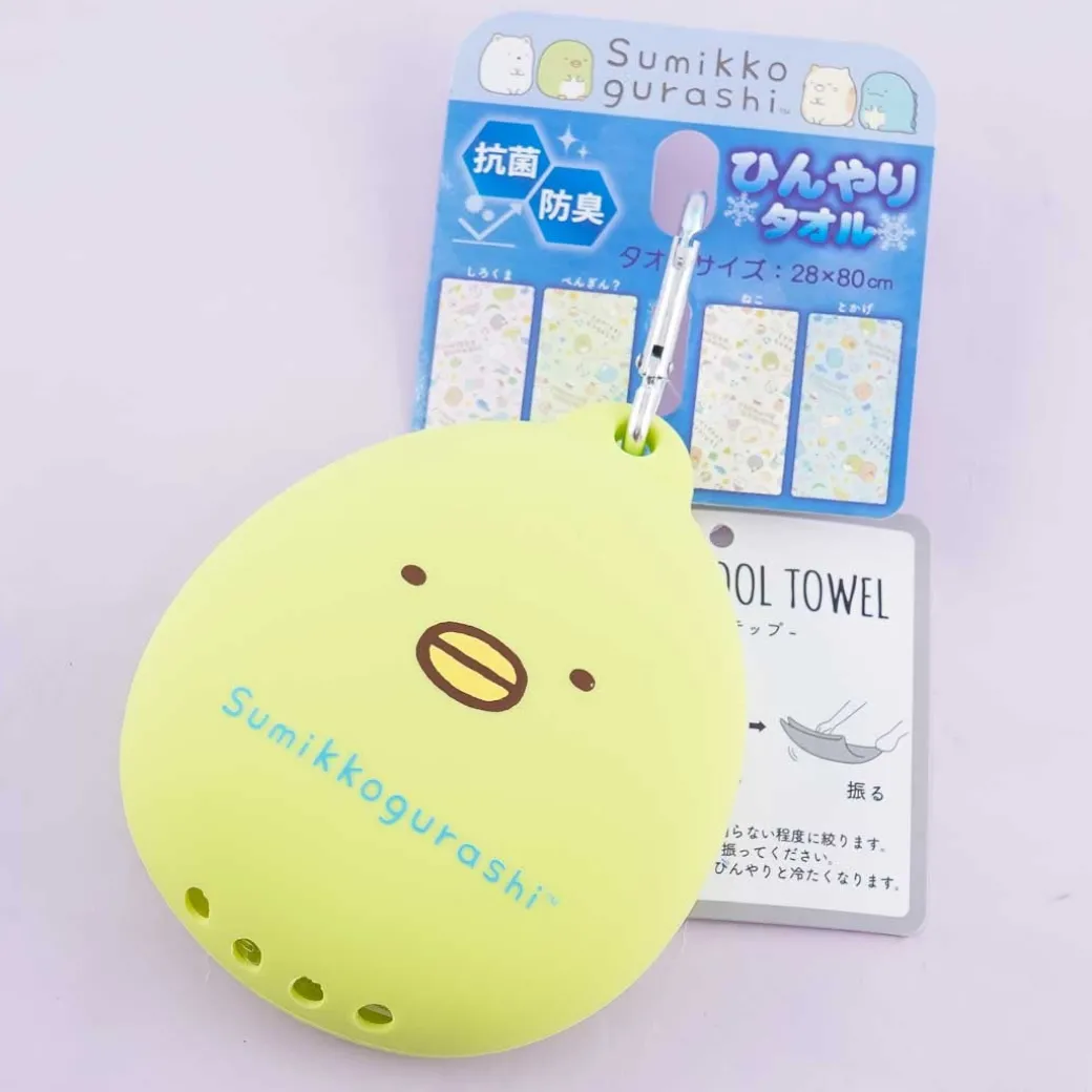 - A cute cooling long towel featuring illustrations of the Sumikko Gurashi characters with a matching Penguin? carrying case