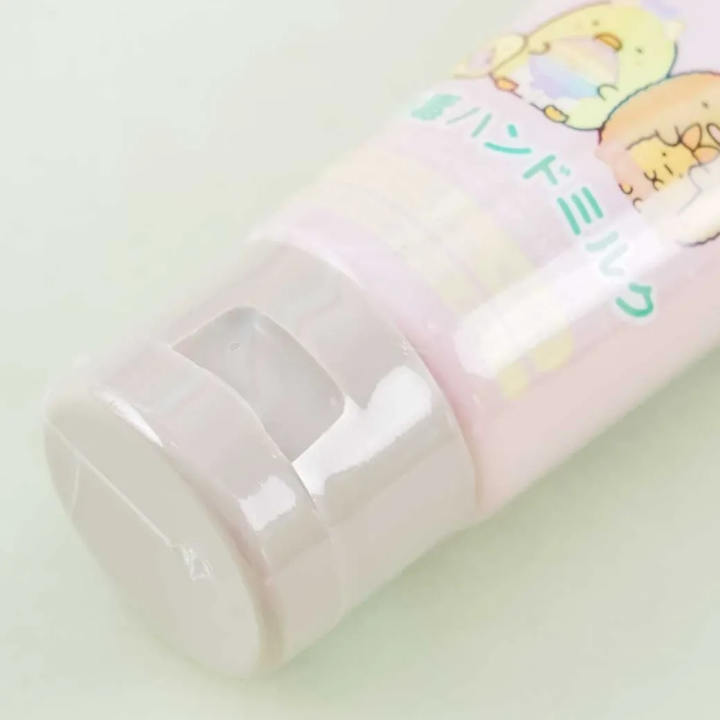 - A compact tube of sanitizing hand lotion illustrated with prints of Sumikko Gurashi characters