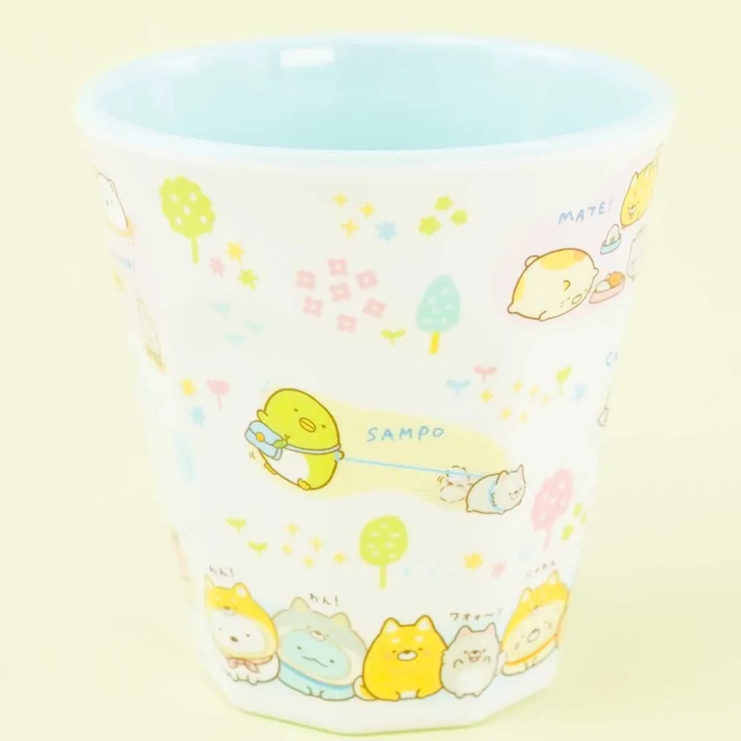 - A cute melamine cup decorated with illustrations of the Sumikko Gurashi having fun with dogs