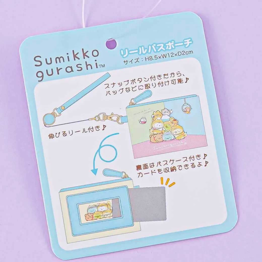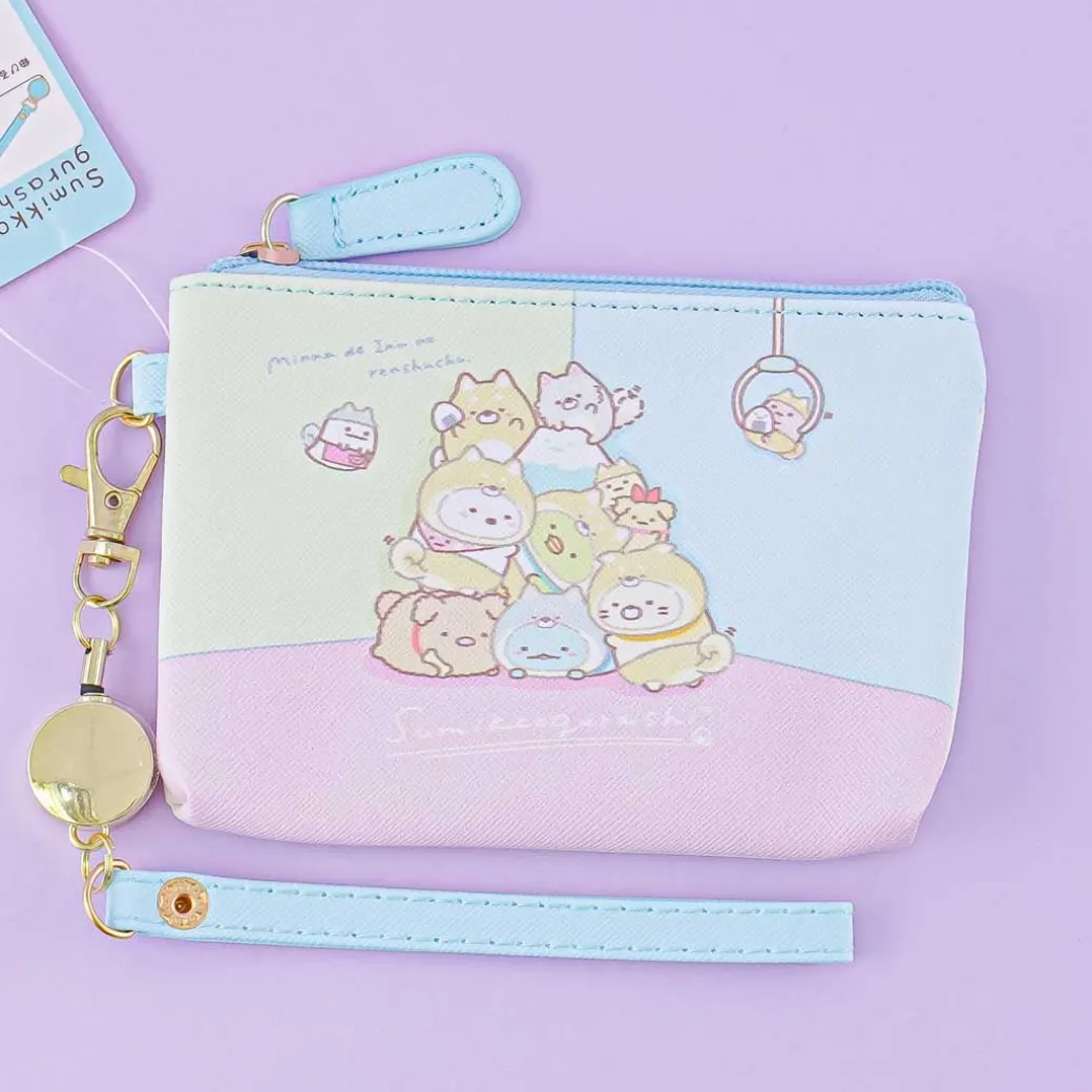 - A kawaii striped coin purse featuring the Sumikko Gurashi gang wearing onesies