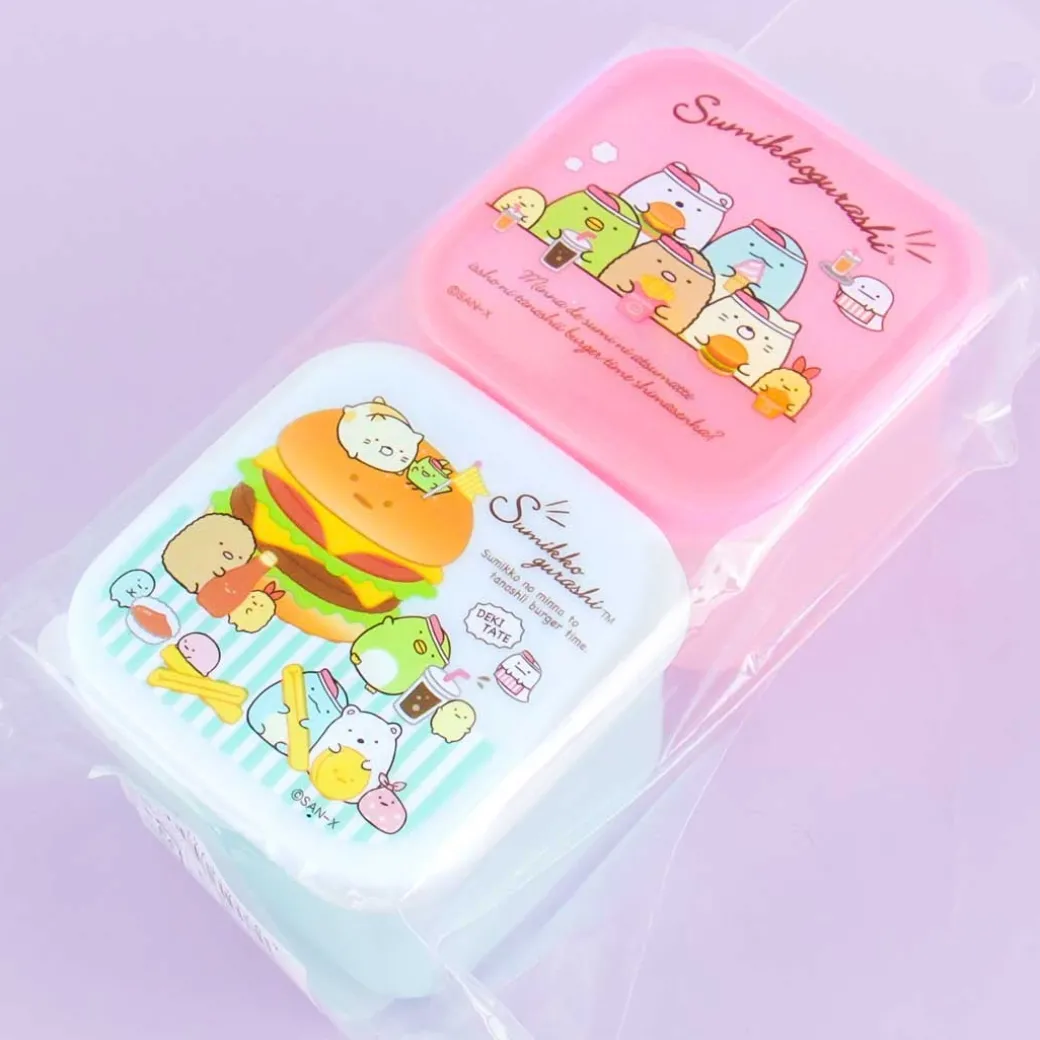 - Lunch boxes featuring Sumikko Gurashi characters eating burgers and other fast food items