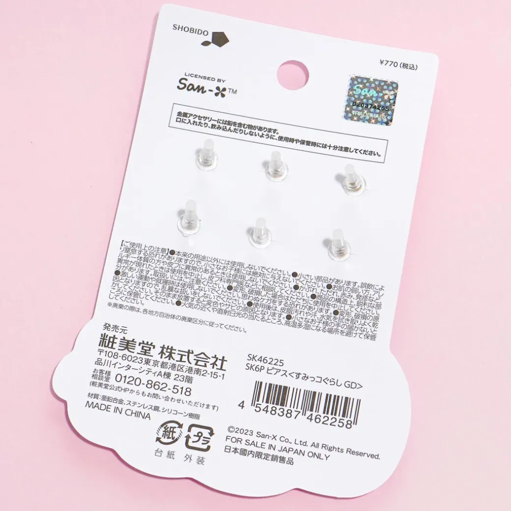 Add this cute set of earrings to your jewelry box. It showcases the Sumikko Gurashi wearing cute flower bunny outfits! These earrings have nice golden accents to them. You need pierced ears to wear these kawaii accessories.