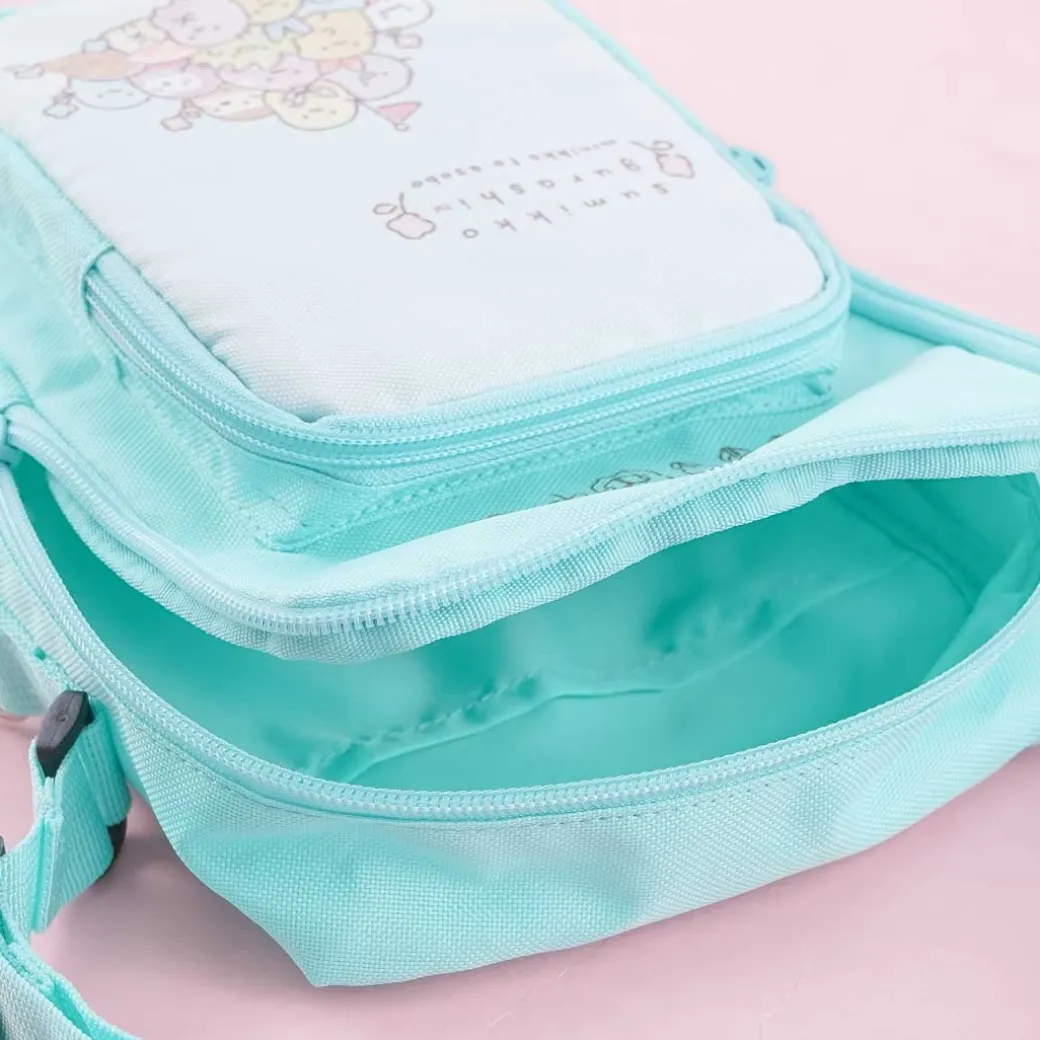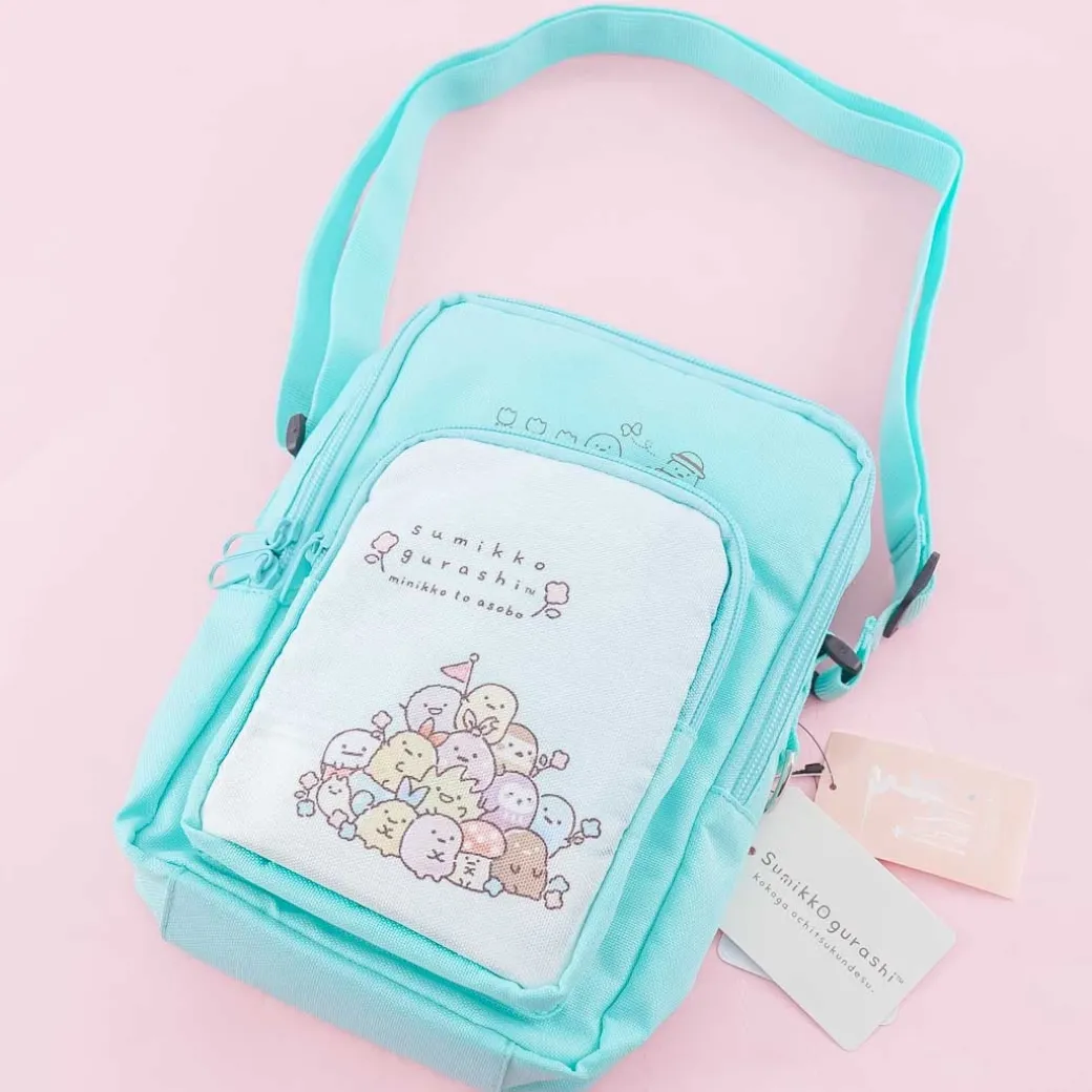 - A super cute rectangle-shaped sling bag with a print of the Sumikko Gurashi characters holding harvested flowers