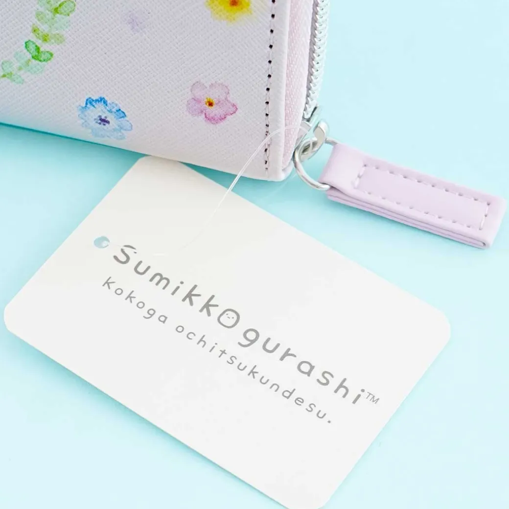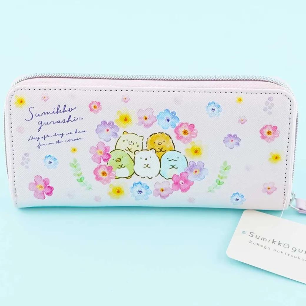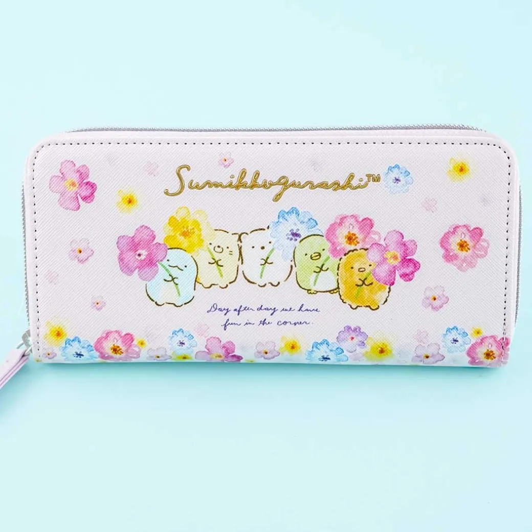 - A super cute long wallet covered in prints of the Sumikko Gurashi playing with colorful flowers