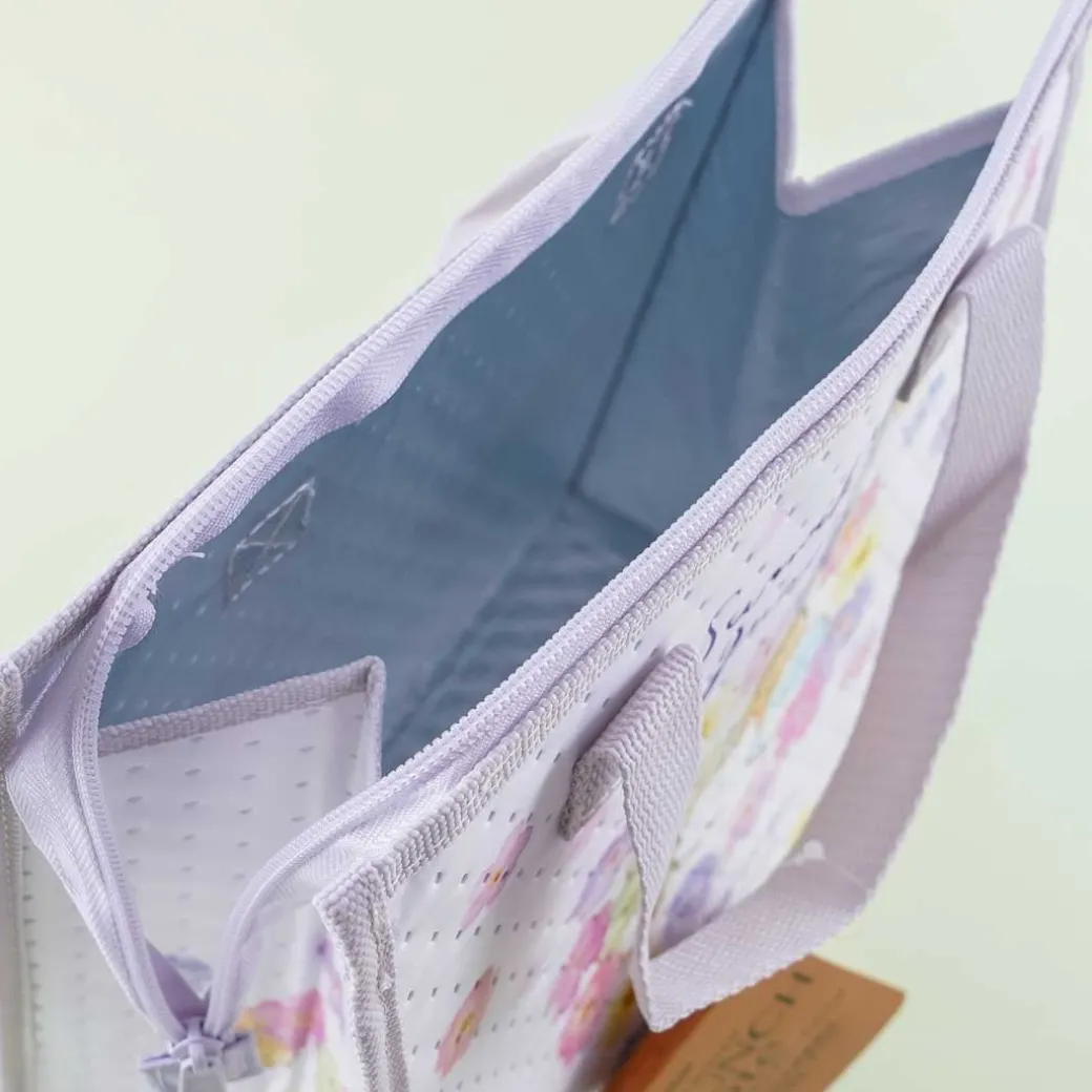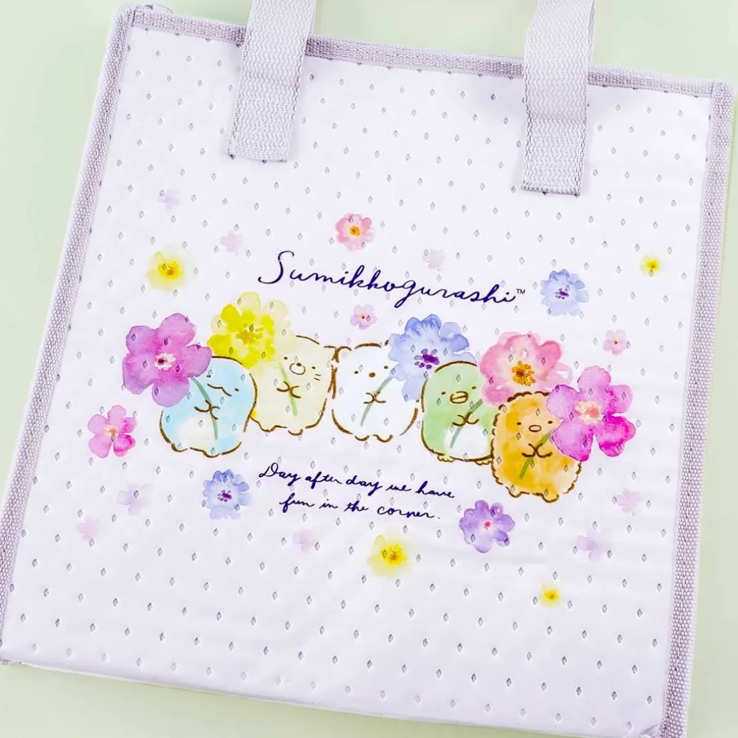- A super kawaii tote lunch bag illustrated with the Sumikko Gurashi and flowers