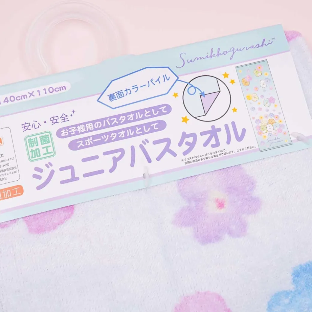- A kawaii thin bath towel decorated with prints of the Sumikko Gurashi surrounded by flowers