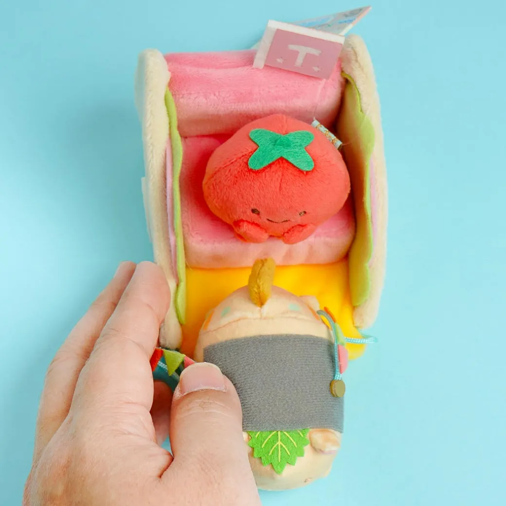 Enjoy playing with this Sumikko Gurashi plushie set! It comes from the Welcome to the Food Kingdom series where the characters are dressed as food. The mini tomato plushie is removable so you can replace it with other plushies from the series.