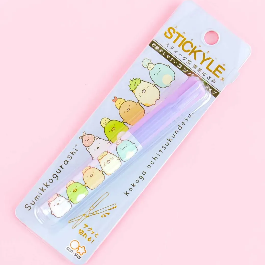- A kawaii pair of stick scissors covered in prints of Sumikko Gurashi characters holding hands
