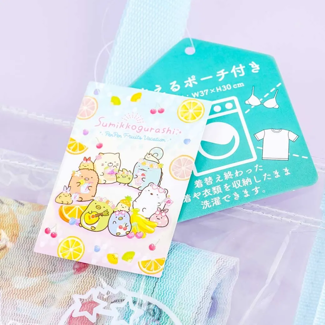 - A kawaii clear vinyl tote bag illustrated with the Sumikko Gurashi carrying flowers and fruits