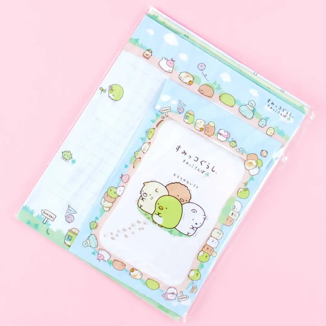 - A cute letter set featuring Sumikko Gurashi characters playing in a garden