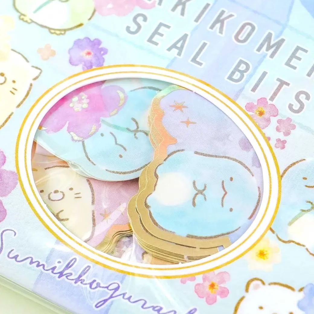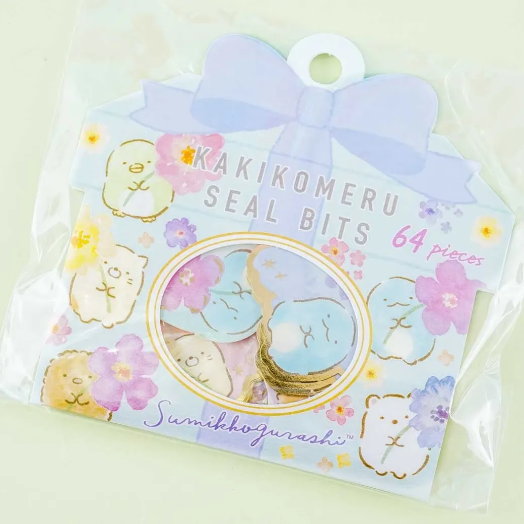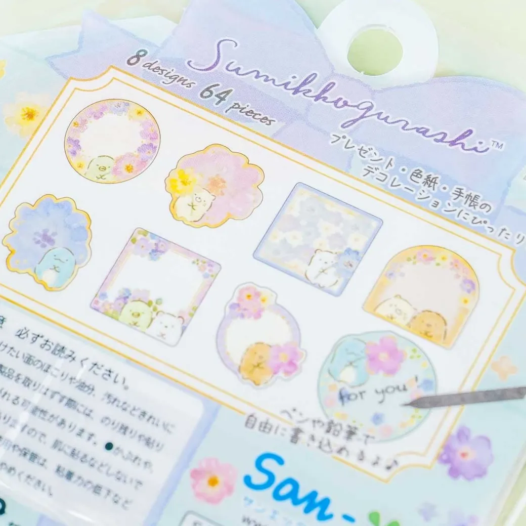 - A die-cut sticker set featuring Sumikko Gurashi characters with large flowers