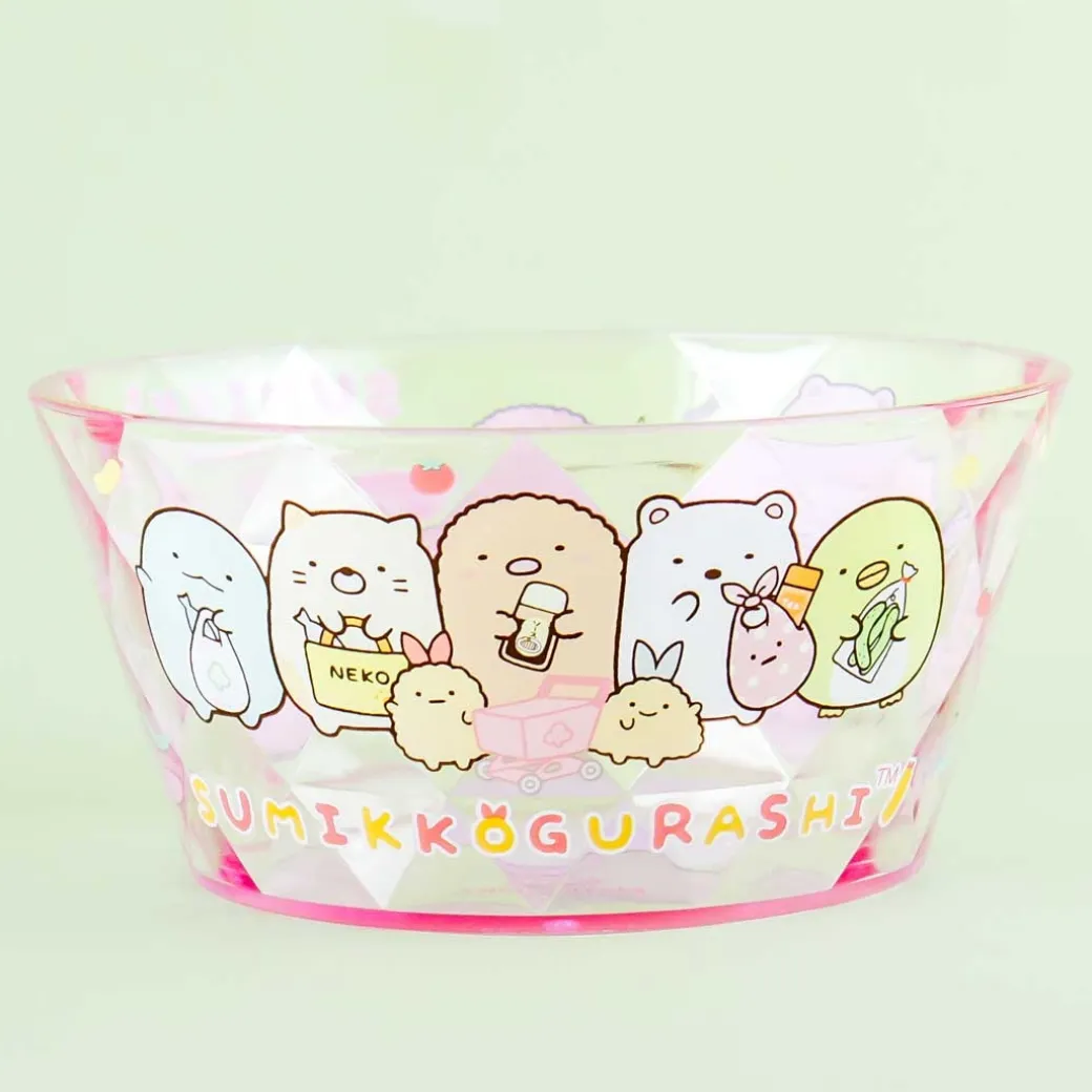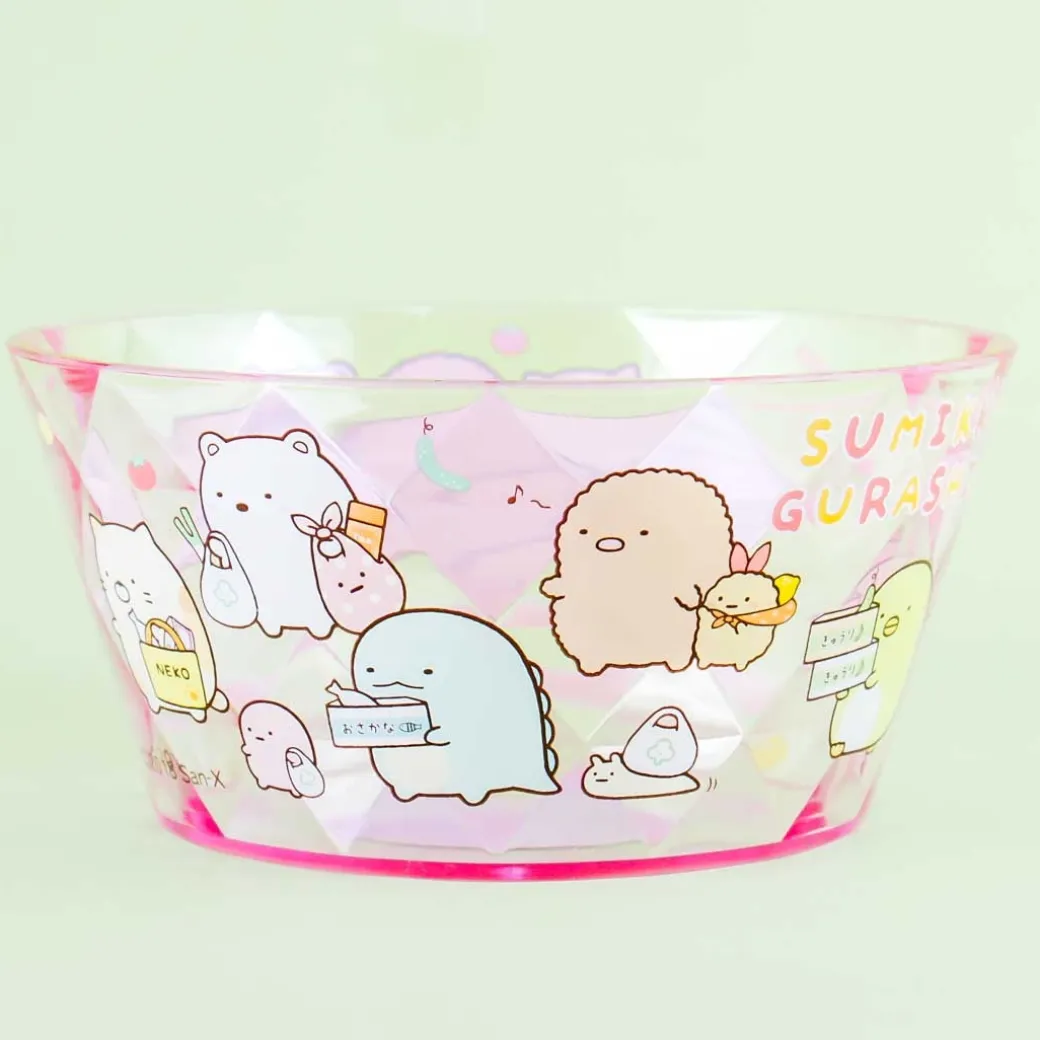 - A super cute transparent bowl featuring Sumikko Gurashi characters buying groceries