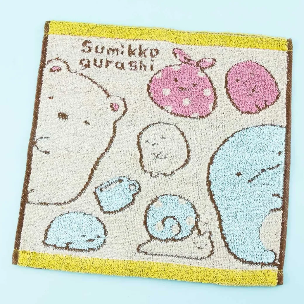 - A cute hand towel featuring prints of the Sumikko Gurashi gathered together