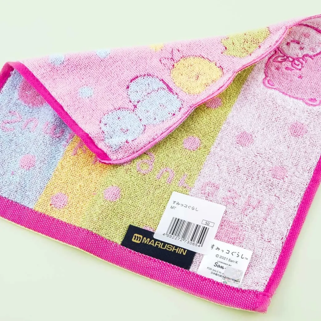 - A cute hand towel illustrated with the Sumikko Gurashi and polka dots