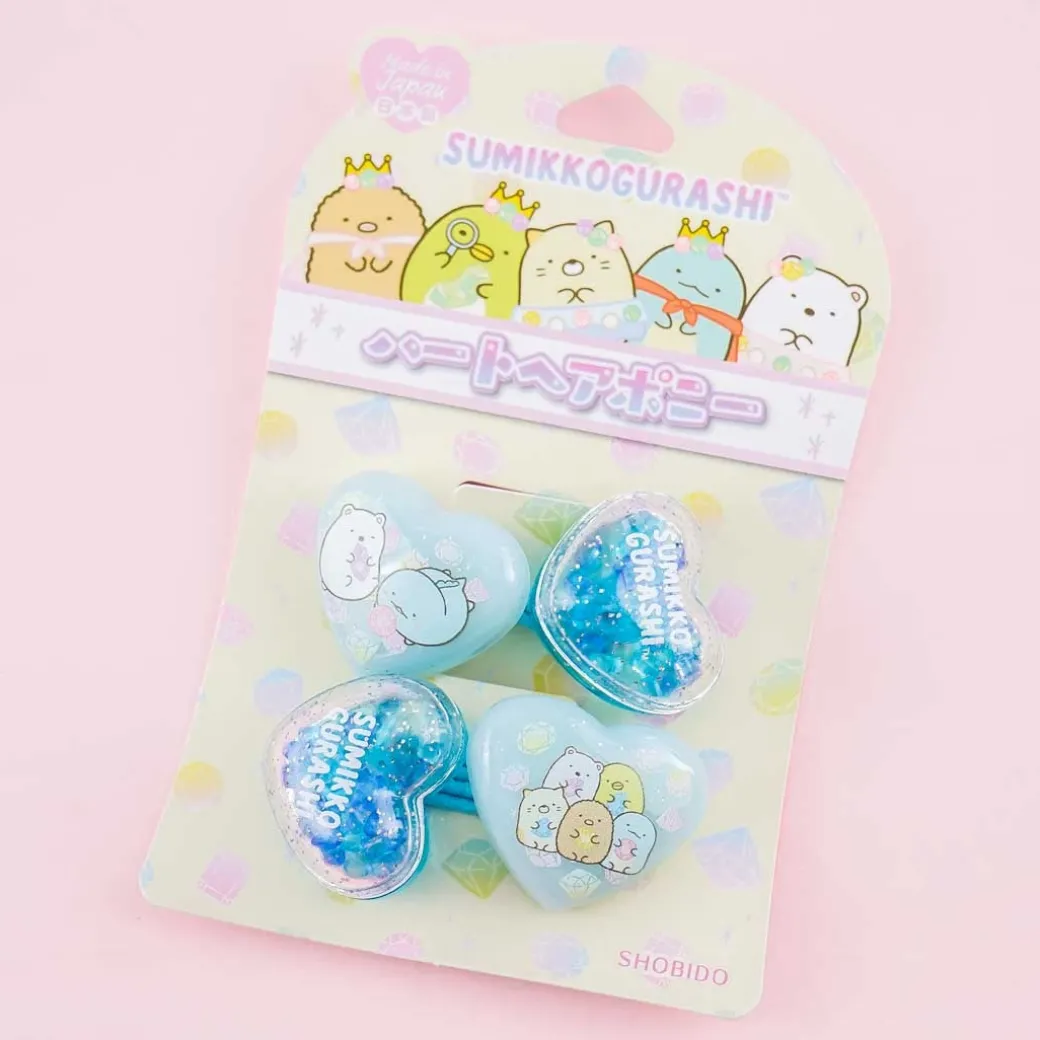 - A kawaii pair of blue hair ties with various heart-shaped charms featuring the Sumikko Gurashi characters