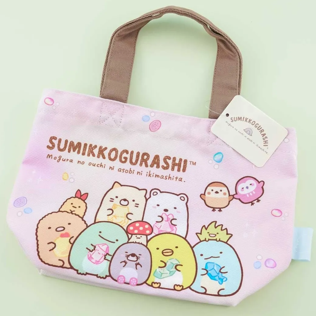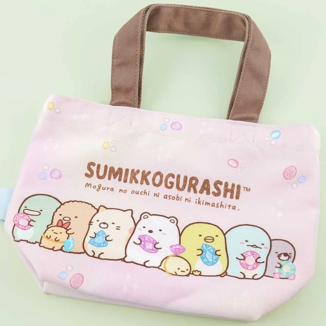 - A kawaii small tote with prints of the Sumikko Gurashi gang holding colored gemstones