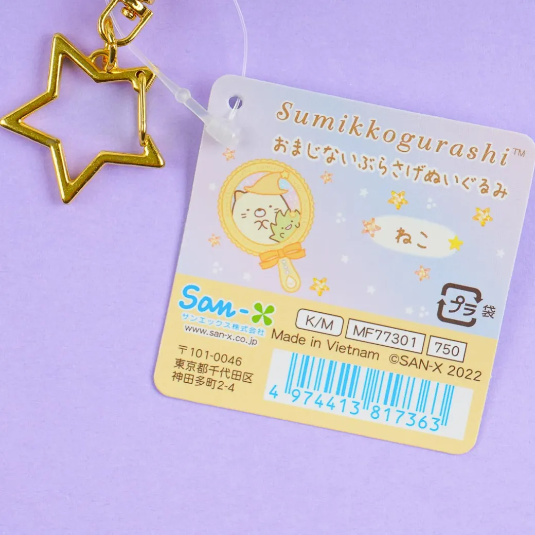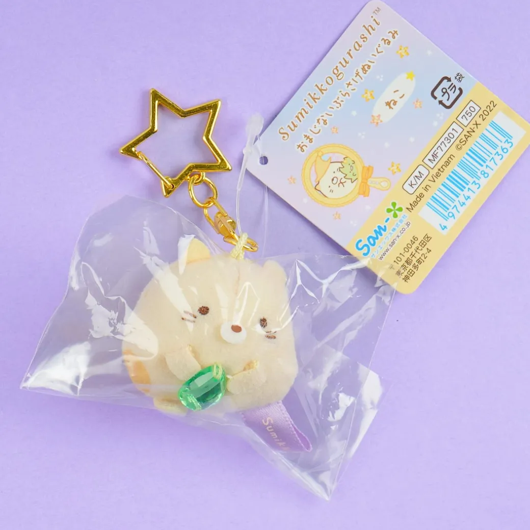This kawaii Neko plush charm holds a shiny jewel for added luck! Attach this Sumikko Gurashi character to your bag using the star-shaped clasp.
