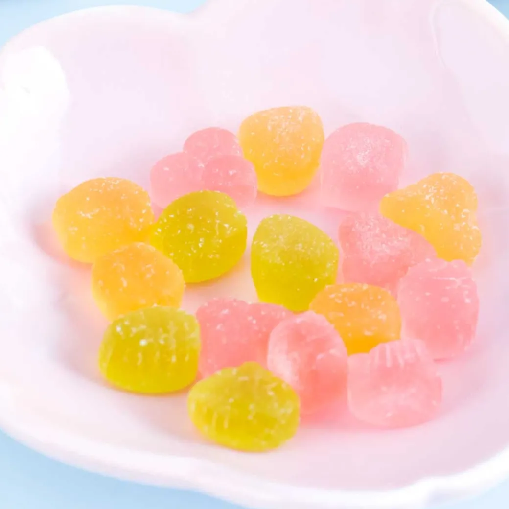 - A pack of grape-flavored gummy candies shaped like Sumikko Gurashi characters
